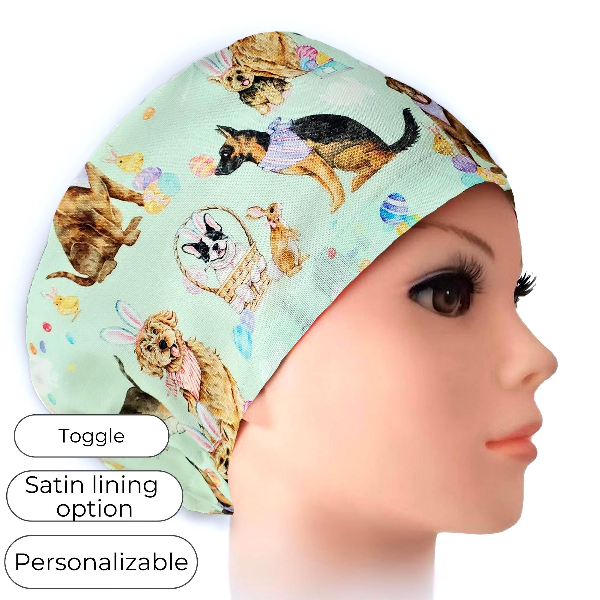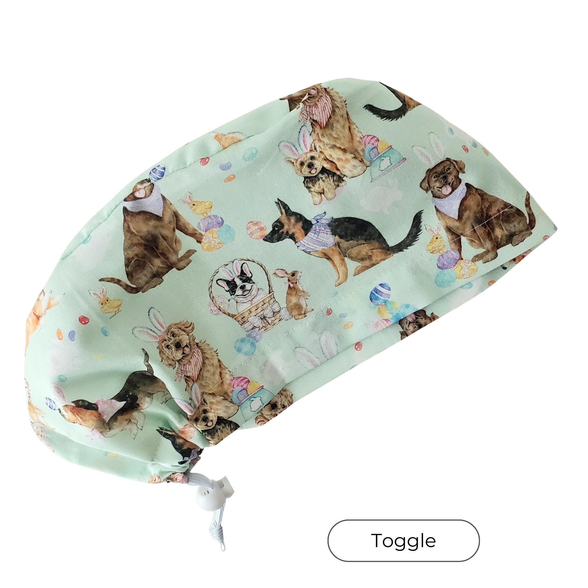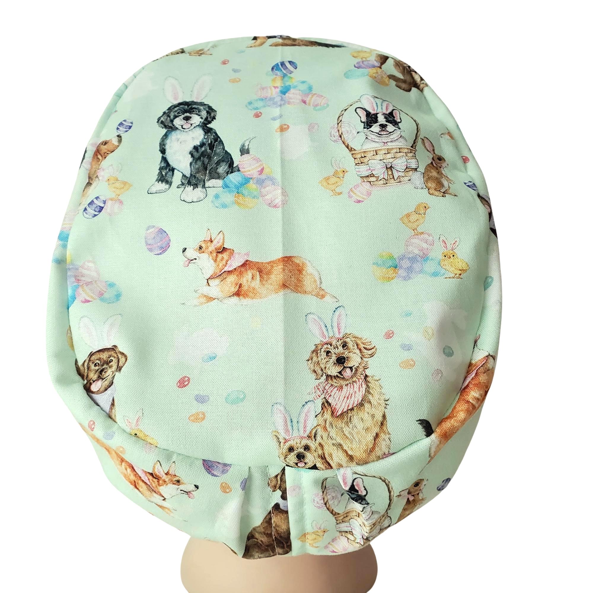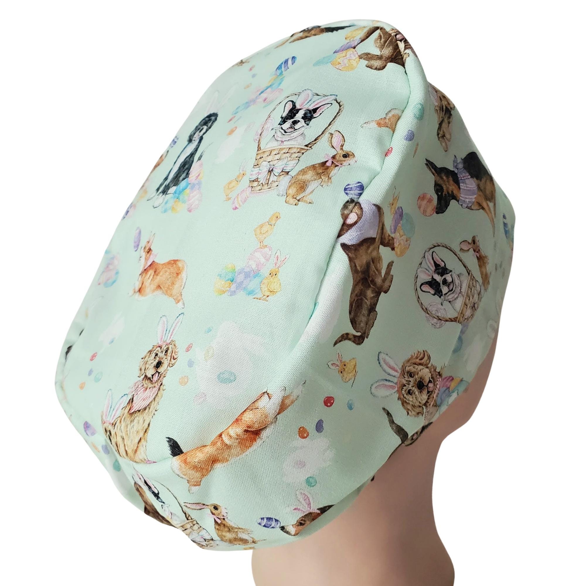 Step into your shift with a blend of charm and practicality, wearing this Euro scrub cap designed especially for healthcare professionals who value comfort and style. Featuring a playful dog scrub cap motif with Ester Dod in Bunny Ears on a soft mint pastel background, this piece brings subtle Easter cheer to your daily routine. Crafted with care, this adjustable scrub hat ensures a secure fit while the satin lining keeps hair smooth and protected.