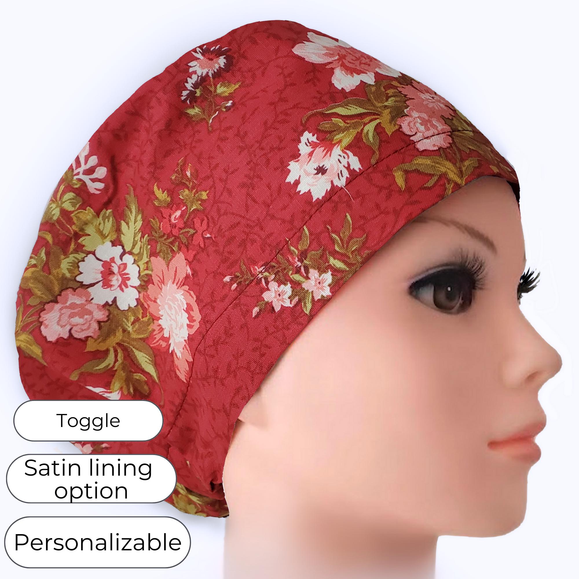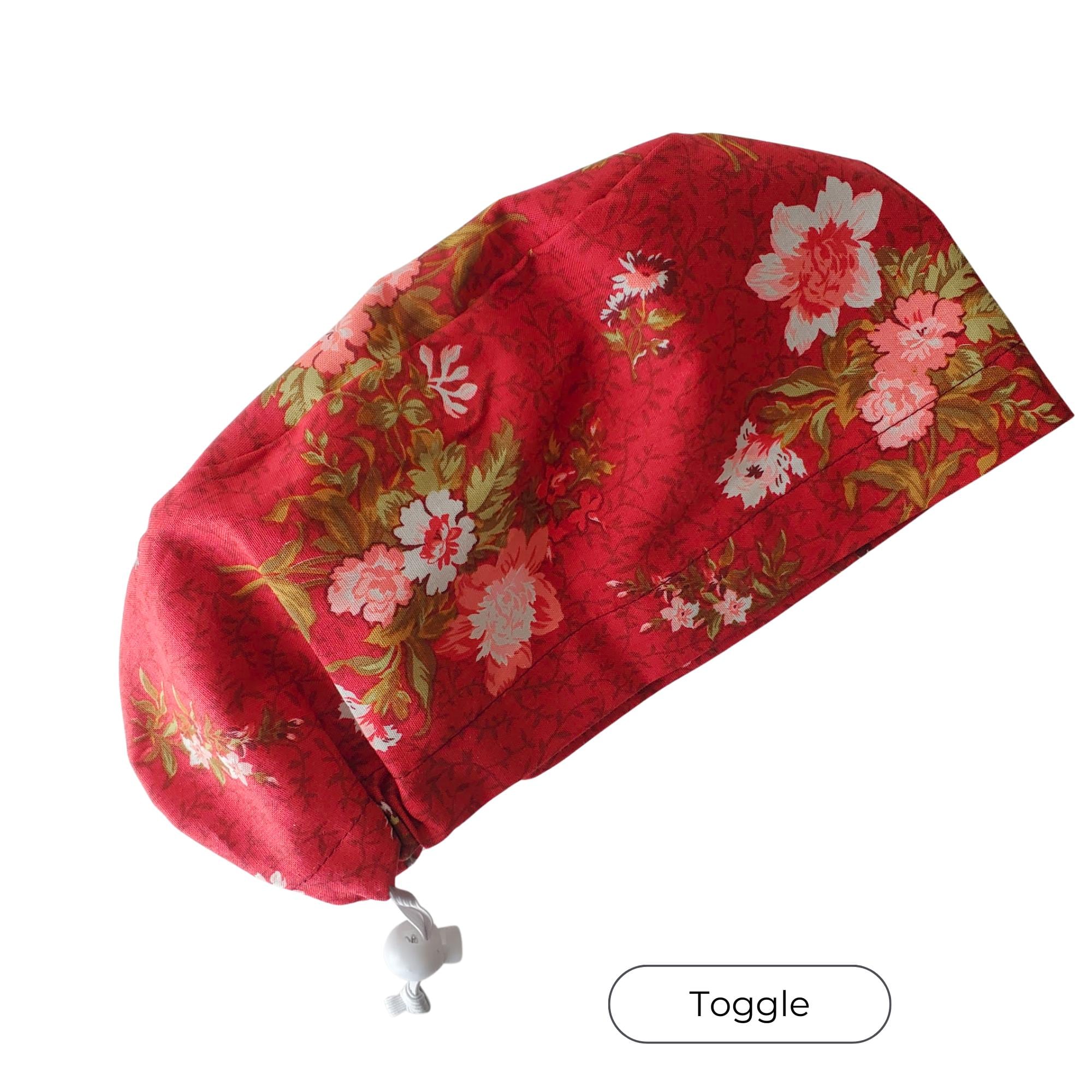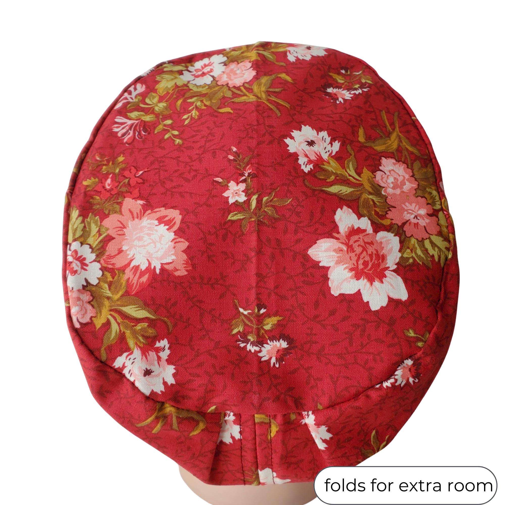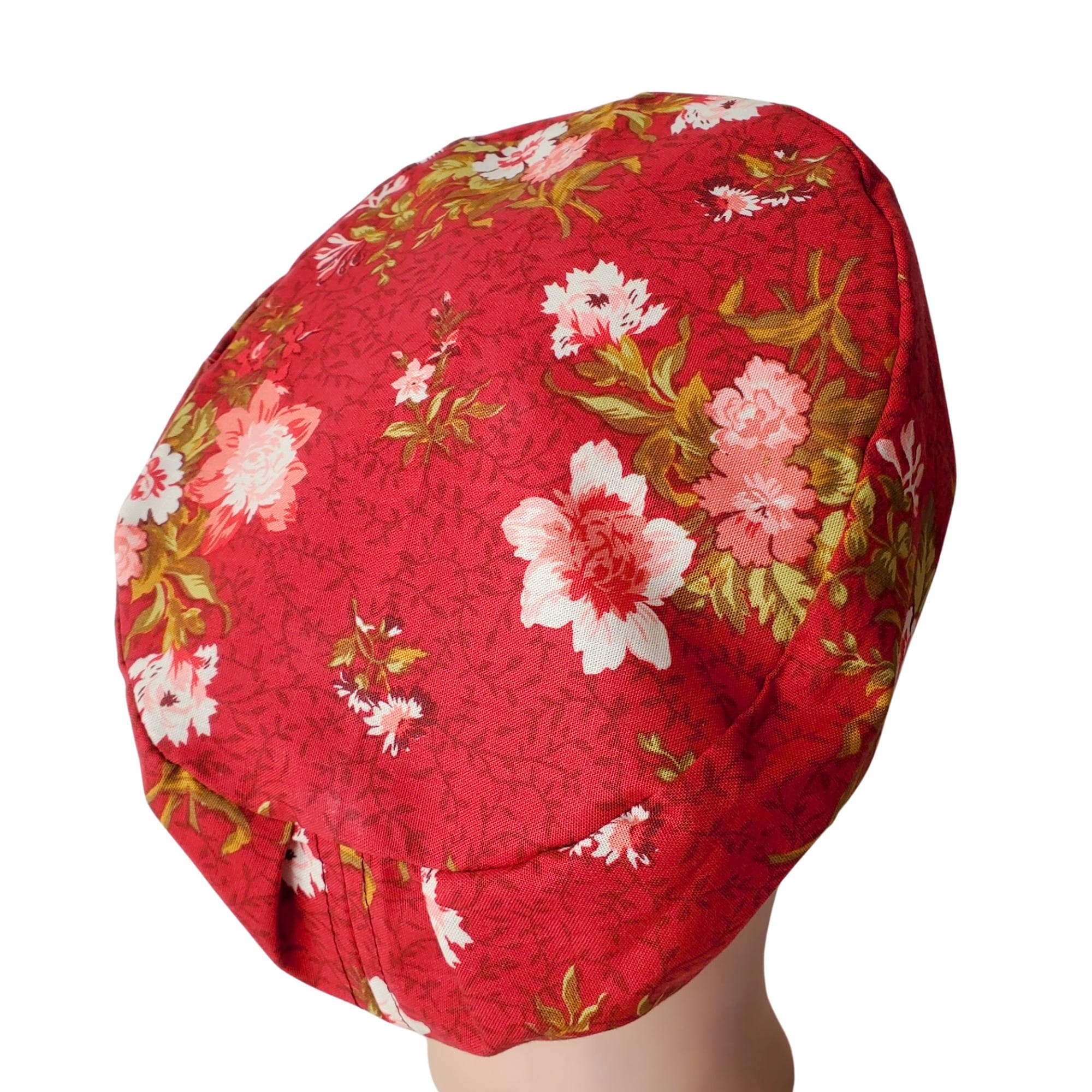 This red floral euro scrub cap is designed for nurses and healthcare professionals who want a polished, professional look with lasting comfort throughout long shifts. The rich red background with soft floral accents adds warmth and elegance while remaining workplace appropriate.