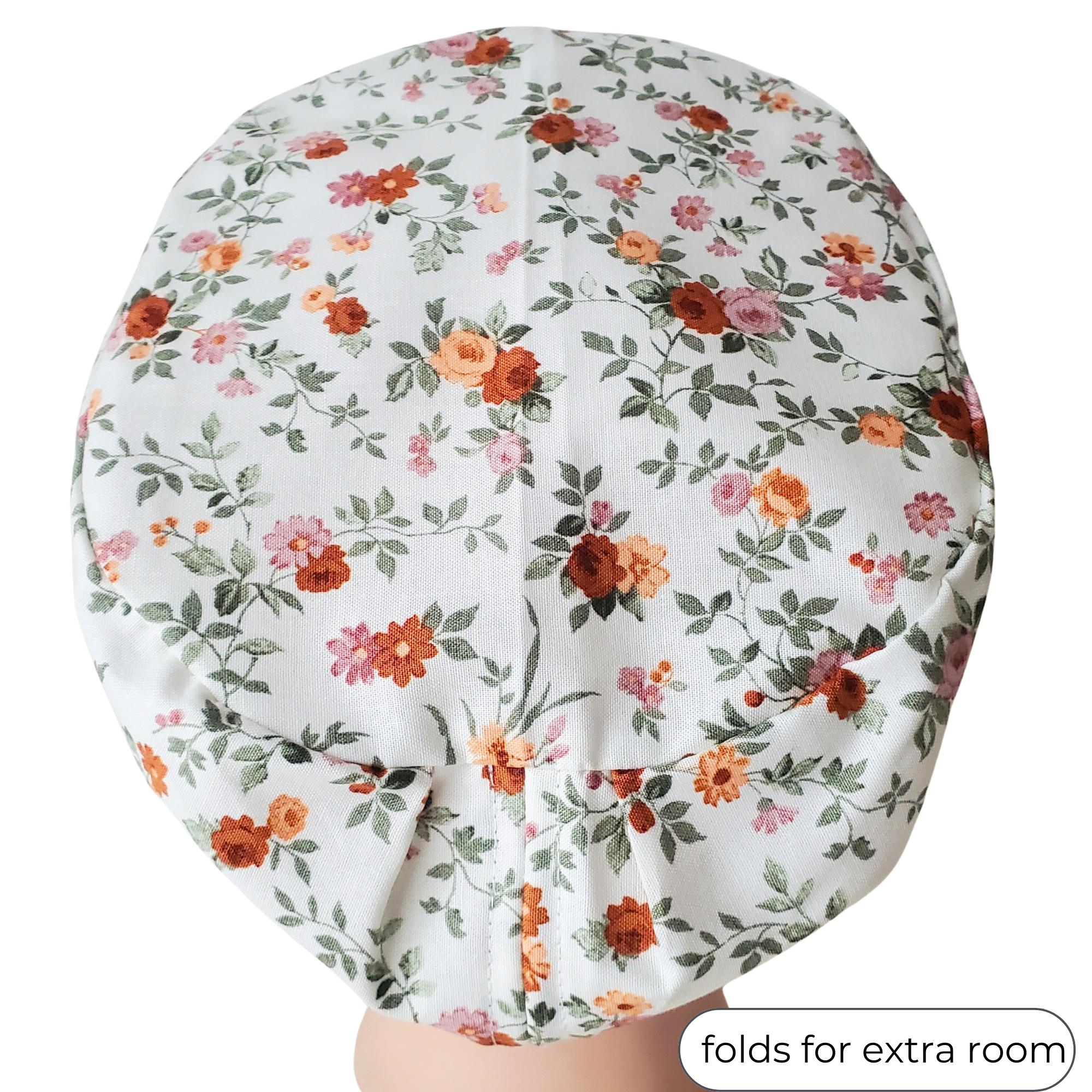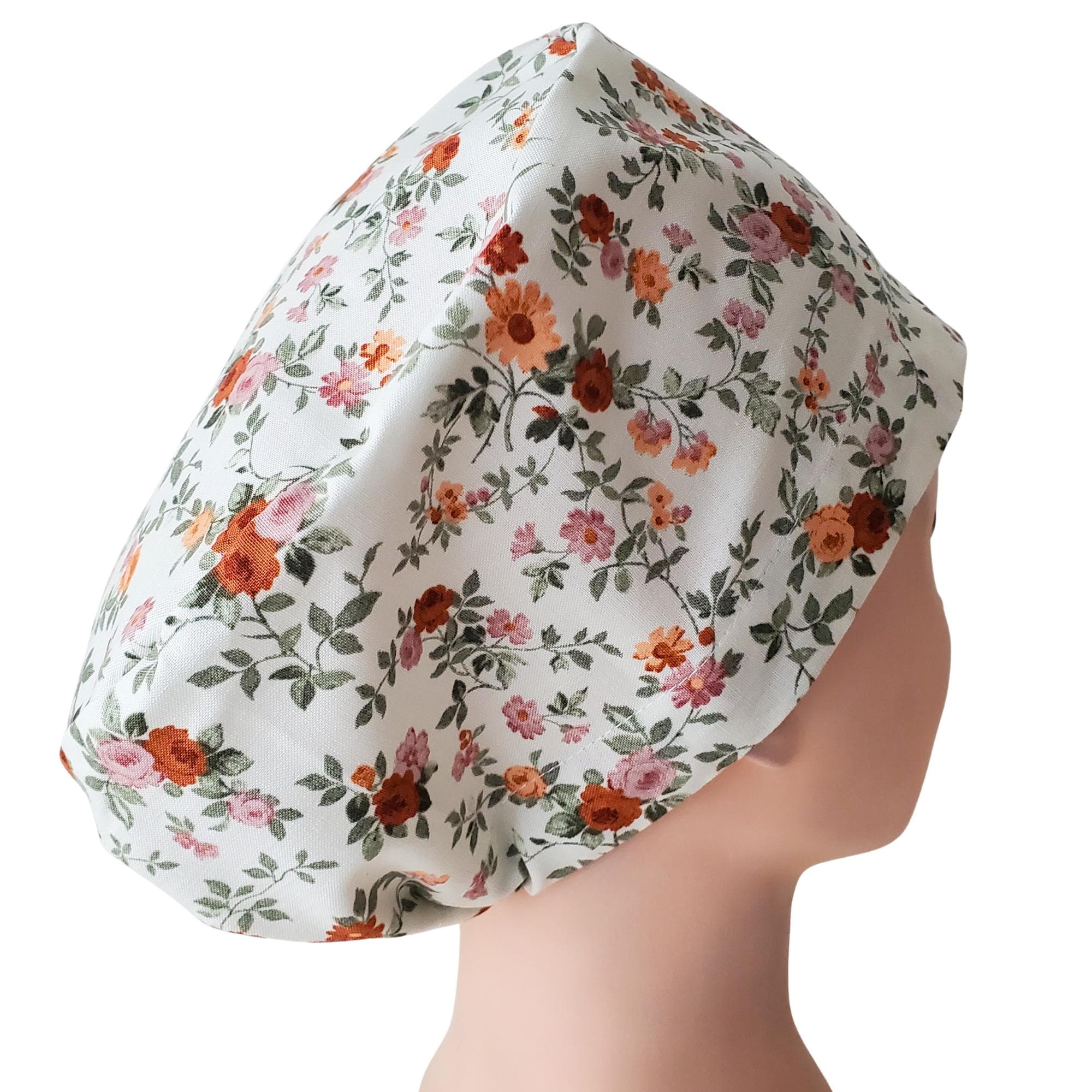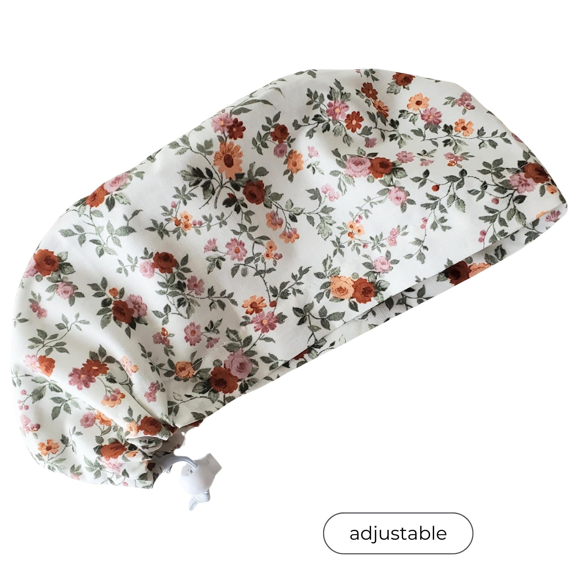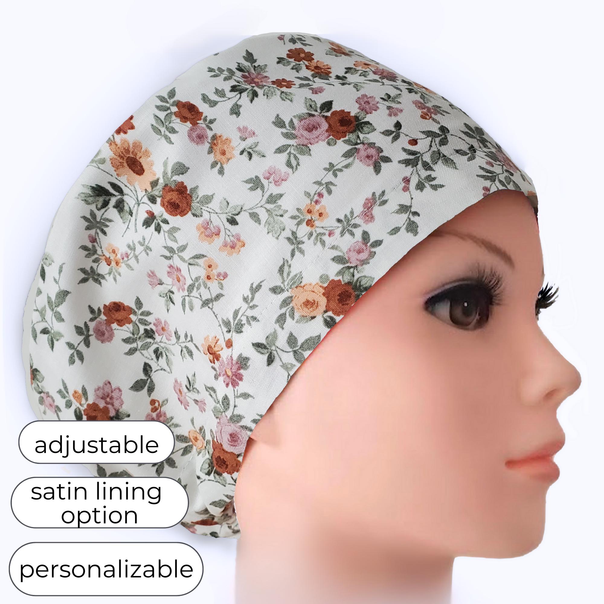 Experience the perfect blend of comfort and style with this neutral floral euro scrub cap, thoughtfully designed for healthcare professionals who value both function and elegance. Featuring a delicate botanical print, this adjustable scrub cap suits surgeons, nurses, and medical staff seeking a refined yet practical operating room hat. Crafted to provide long-shift comfort, its breathable cotton fabric and optional satin lining offer gentle care for your hair while maintaining a professional appearance.