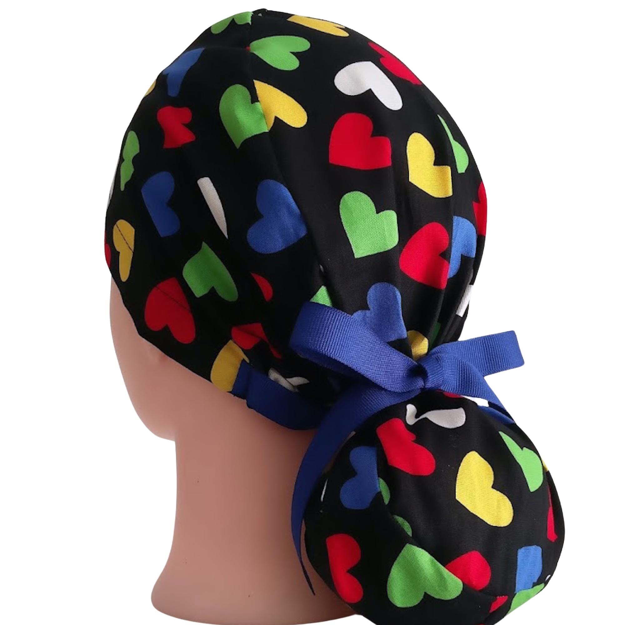 Add comfort and personality to your workday with this multicolor heart ponytail scrub cap, thoughtfully designed for healthcare professionals with long hair. Featuring a playful conversation-heart pattern with cheerful colors and classic Valentine look, this scrub hat brings a fun, uplifting touch while remaining professional and easy to style with any uniform.