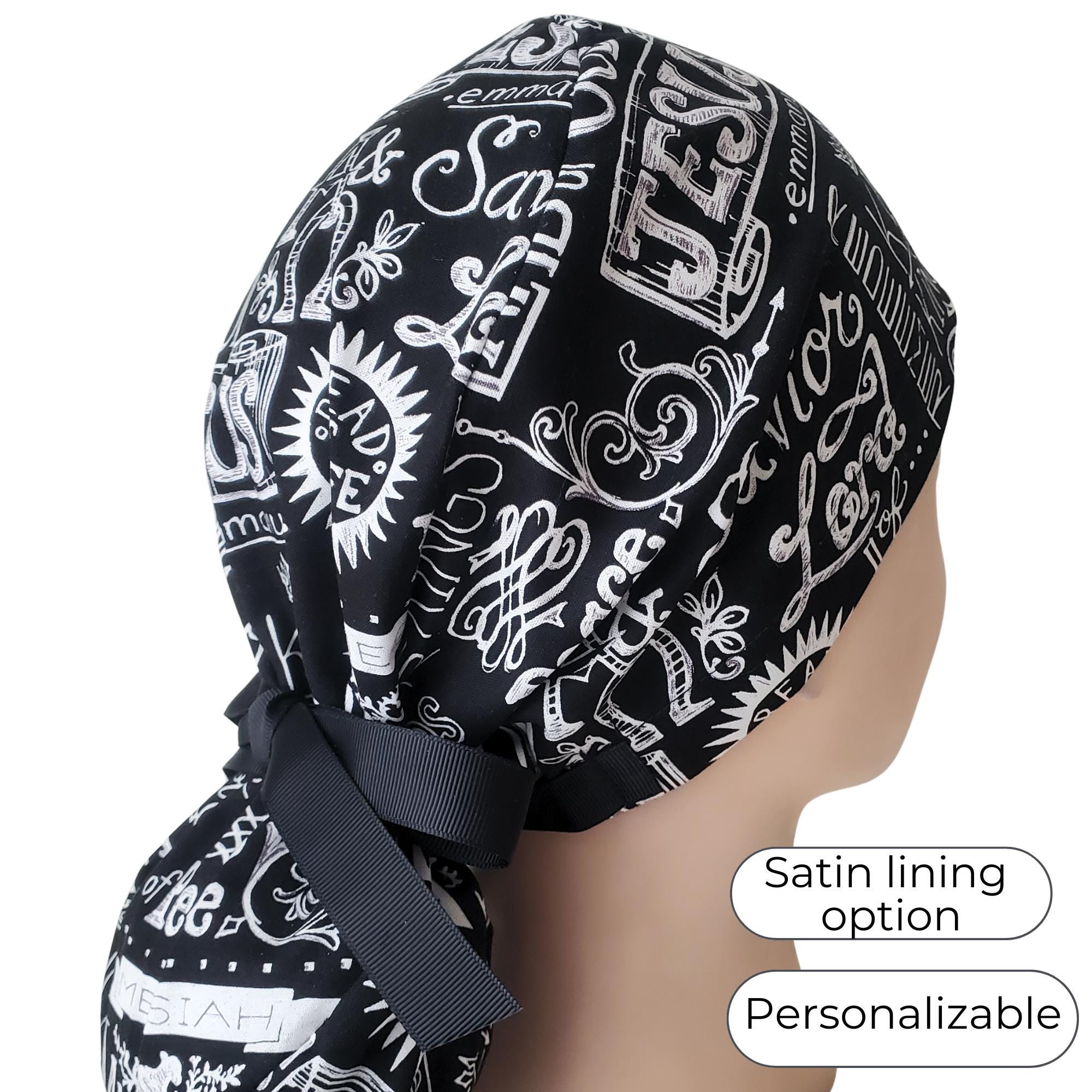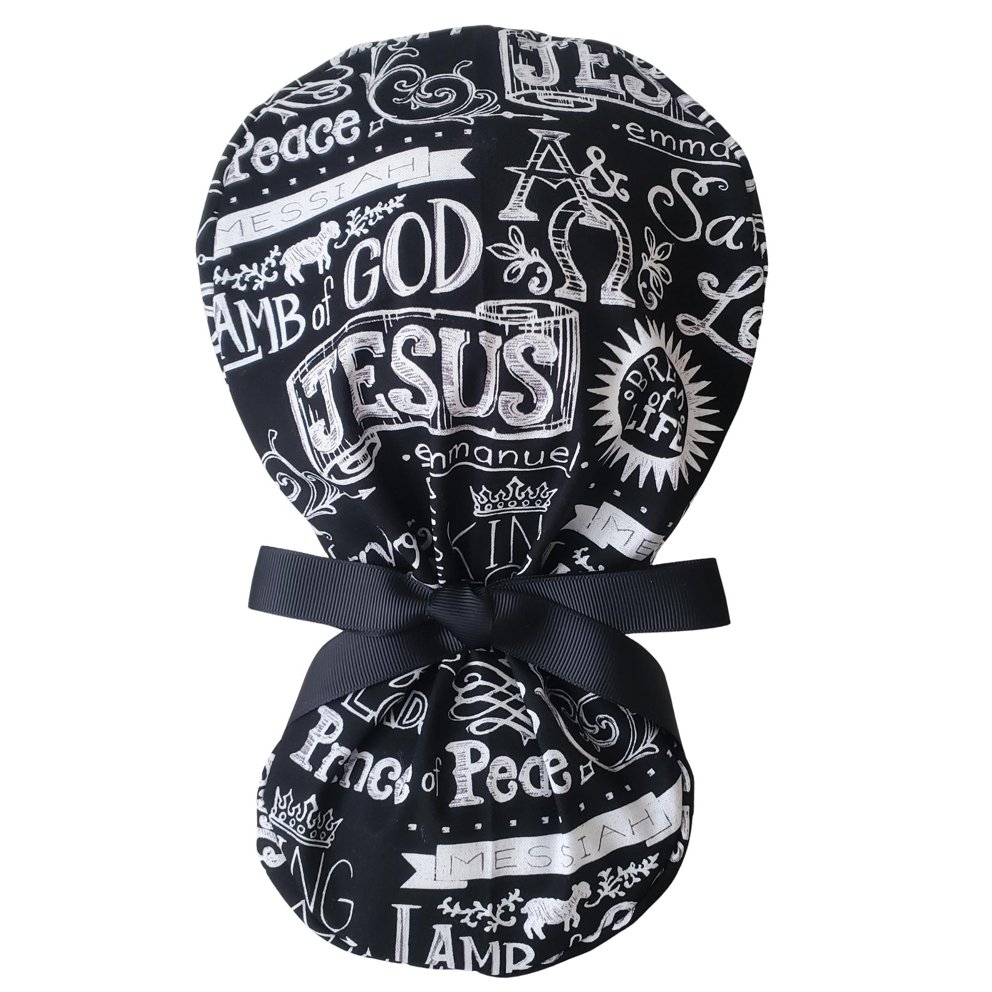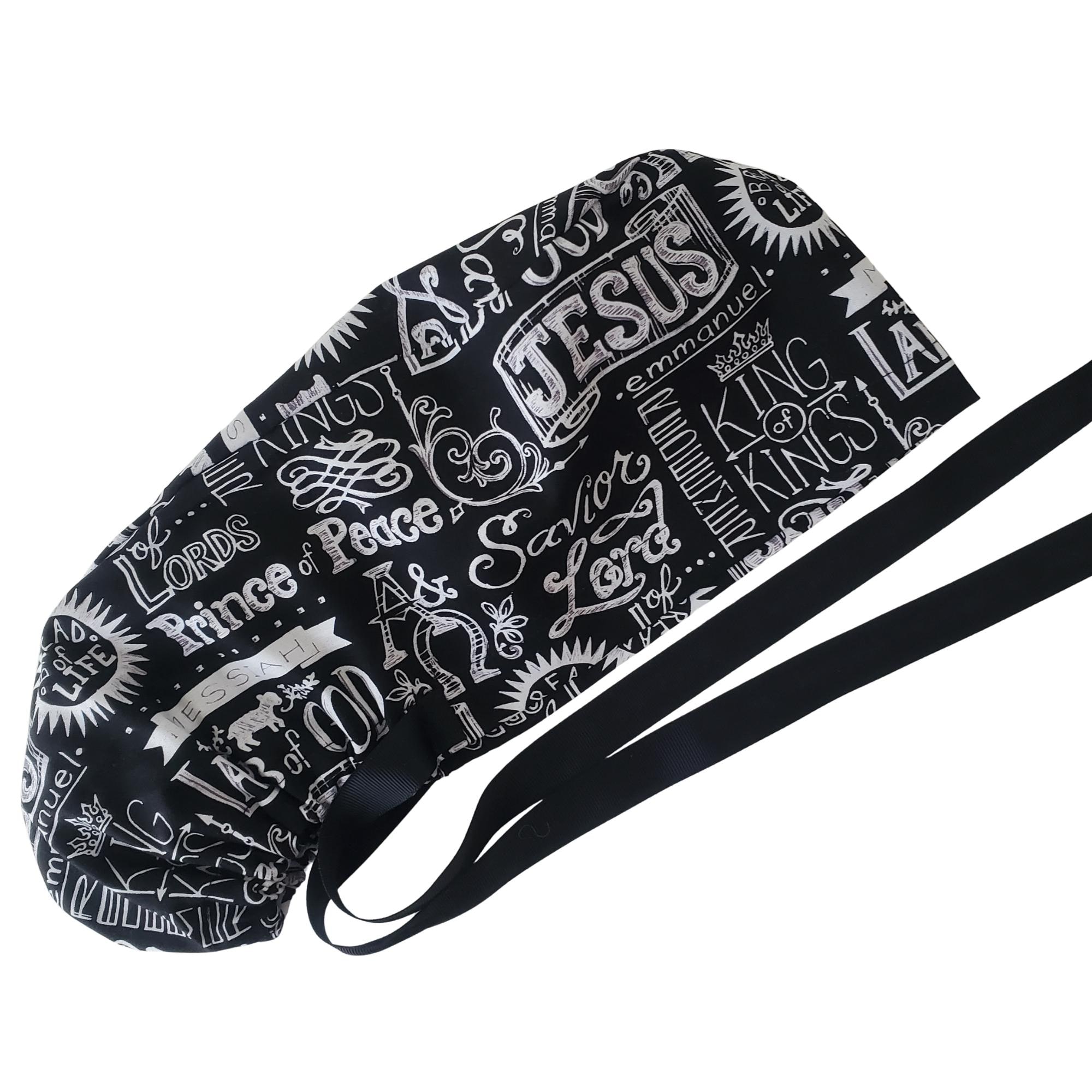 This faith-inspired ponytail scrub cap features a bold black background with white typography celebrating Christian messages, including words such as Jesus, Savior, and Prince of Peace. Designed to offer both comfort and meaning, this scrub hat allows you to carry your faith with you throughout your workday.
