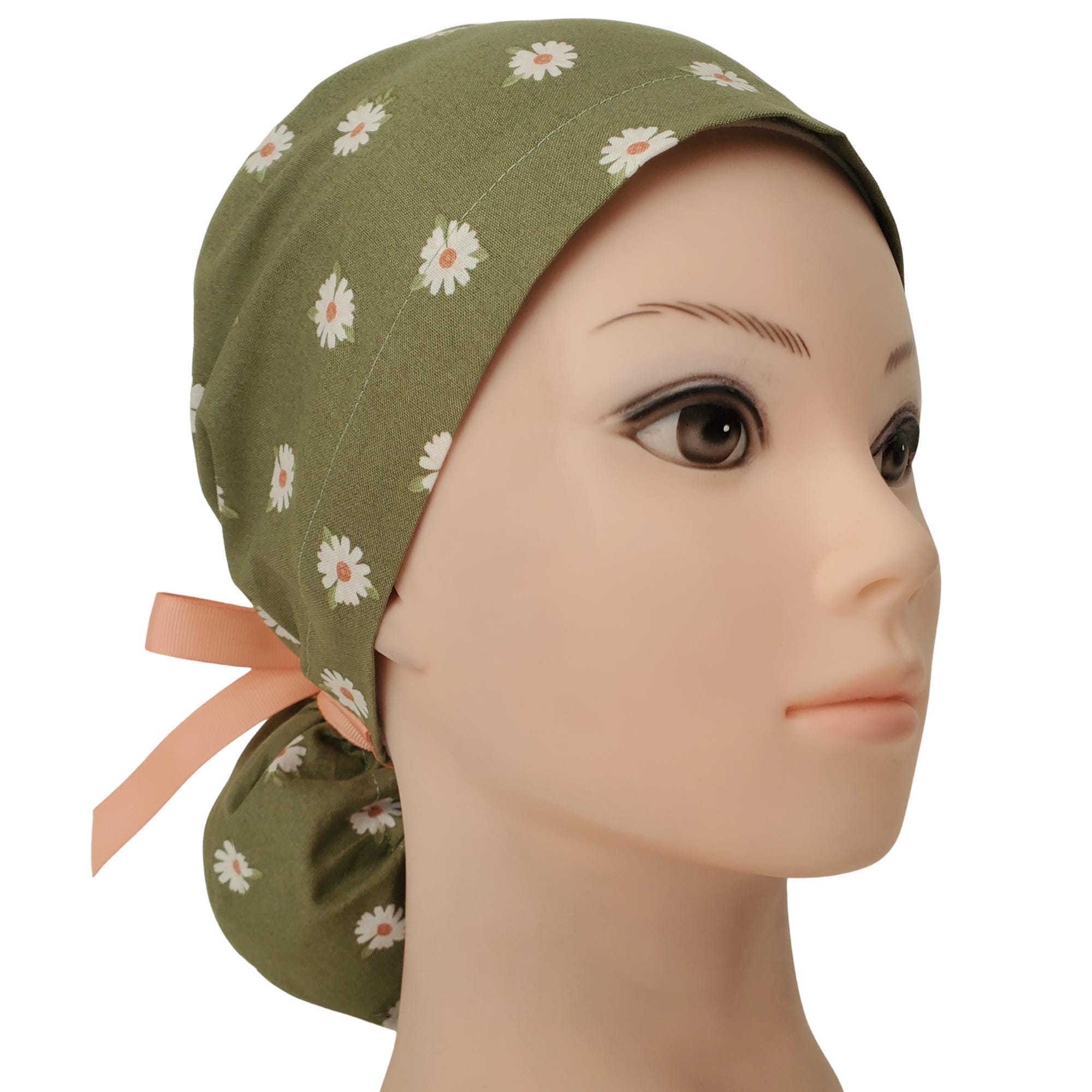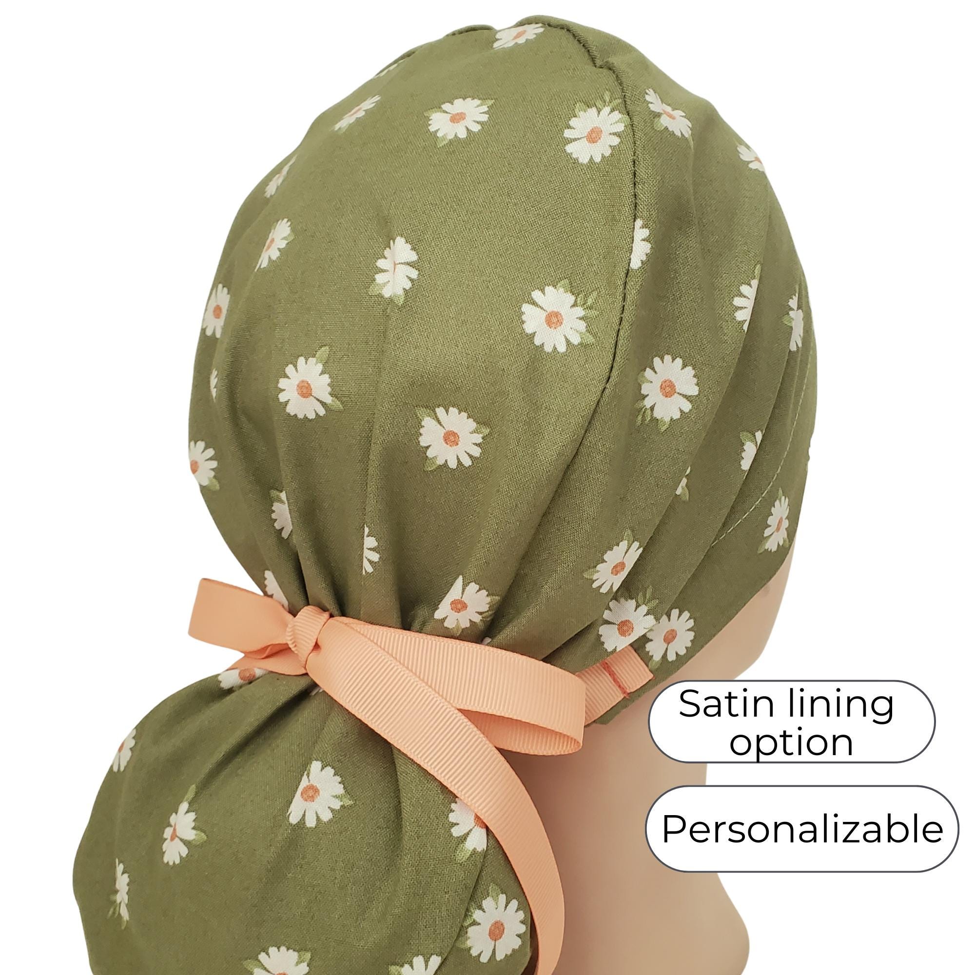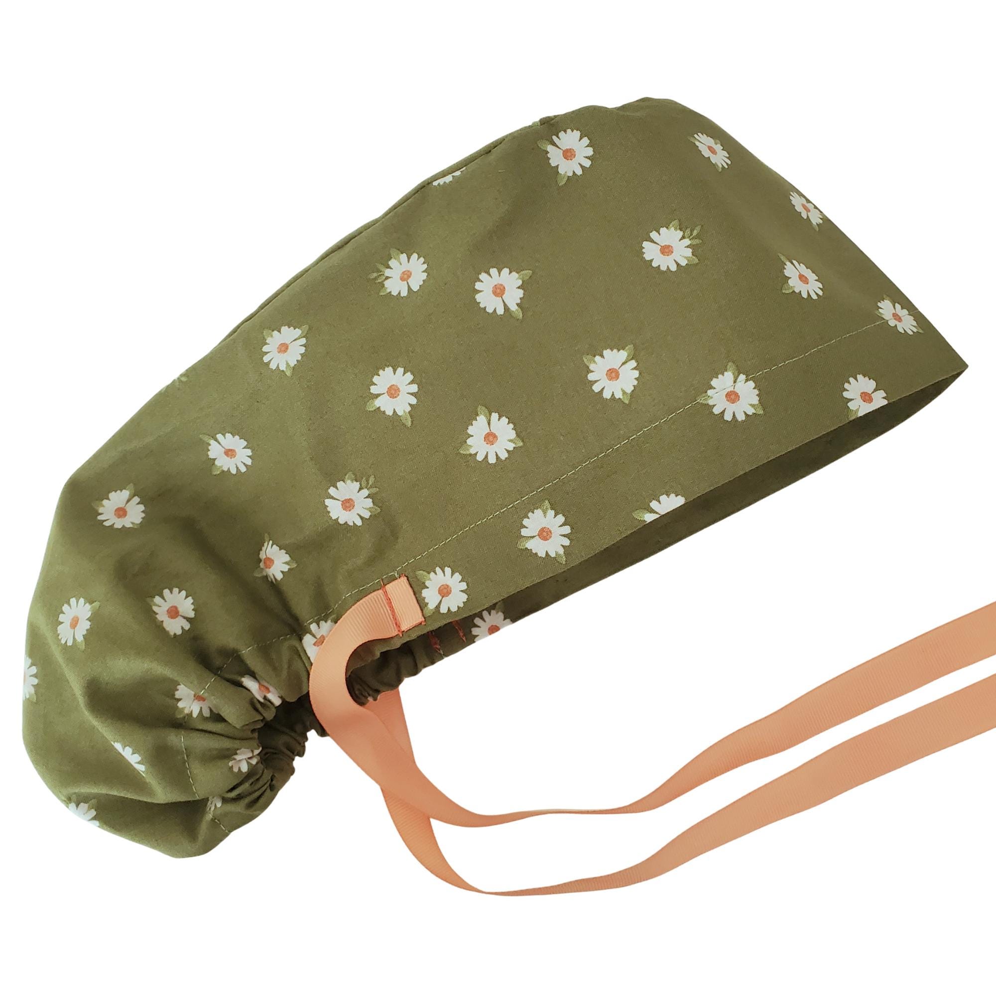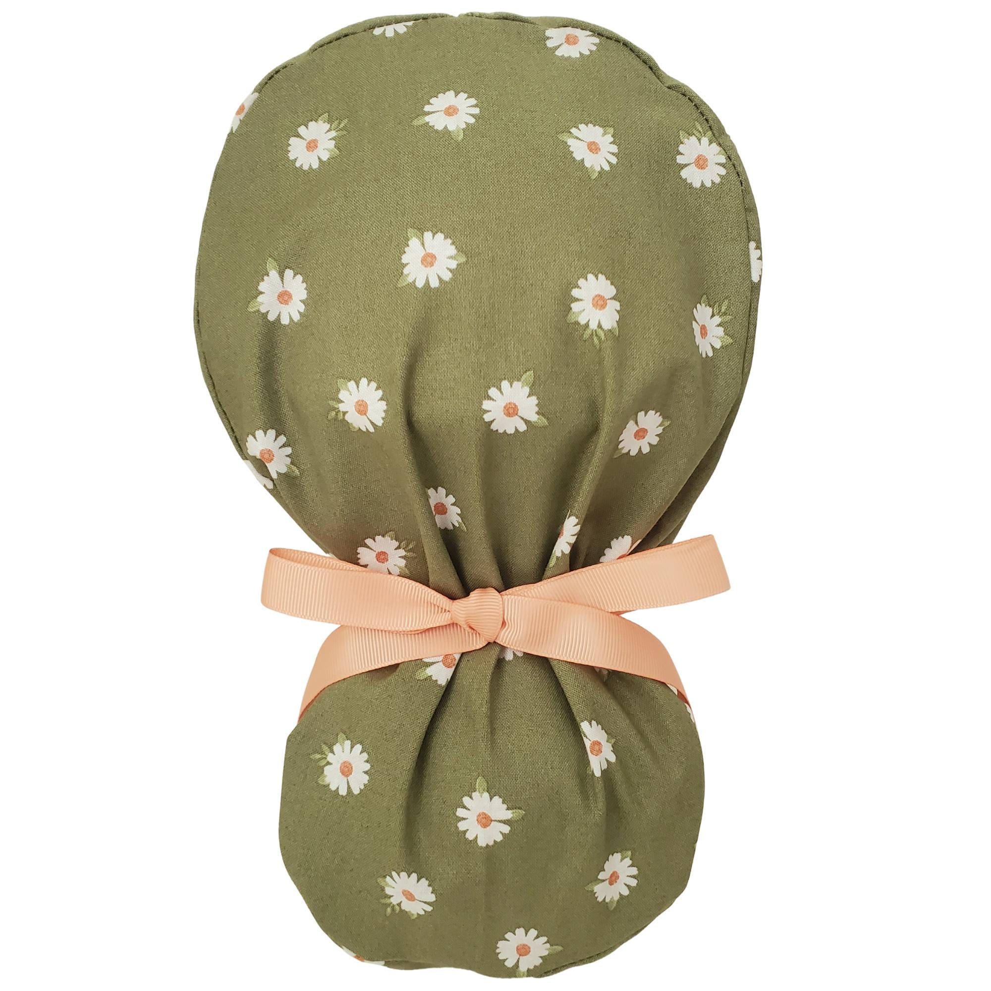 Soft, earthy, and effortlessly elegant, this olive daisy ponytail scrub cap brings a calm, natural aesthetic to your workday. The muted olive green background is paired with delicate white daisies, while warm peach ties add a subtle, modern contrast.