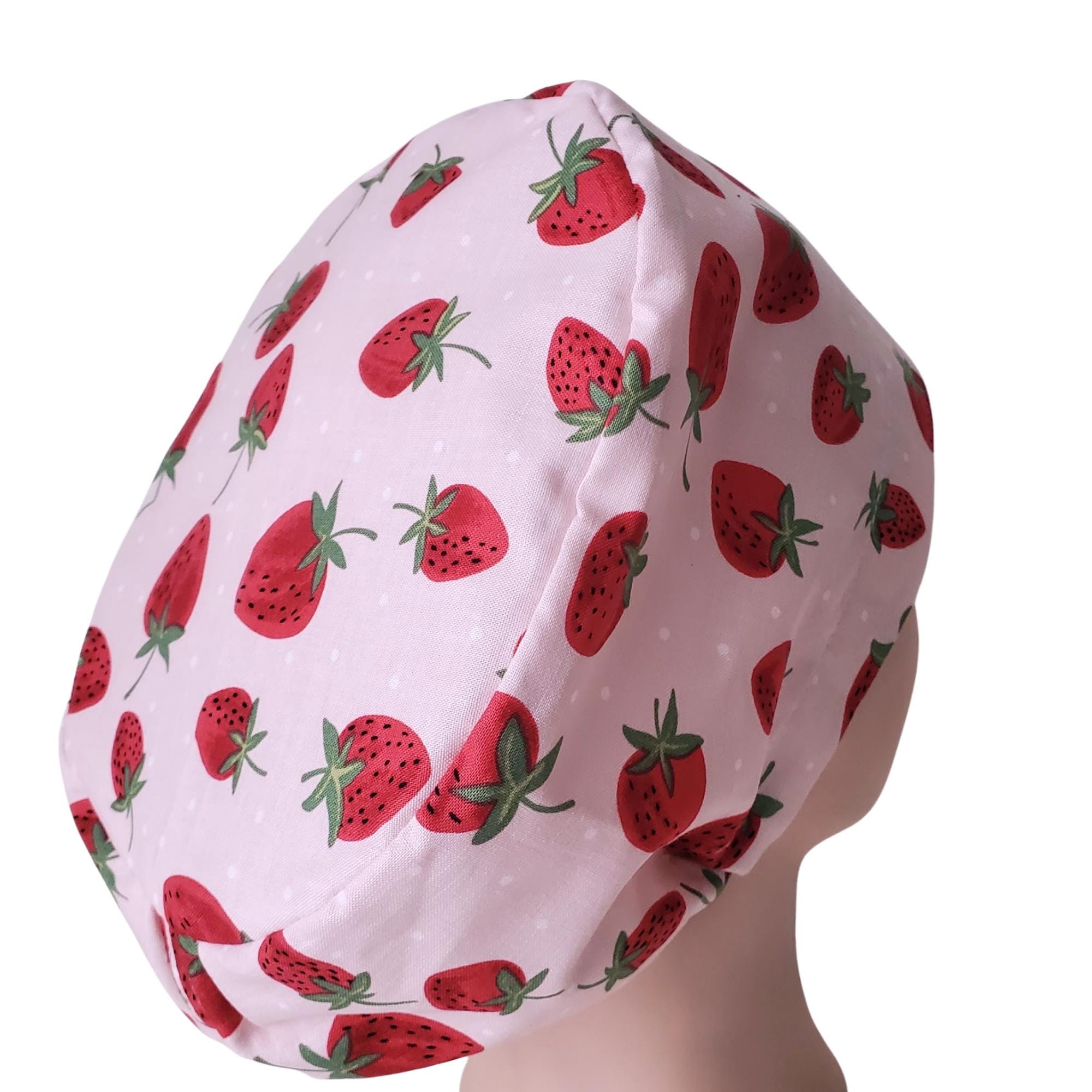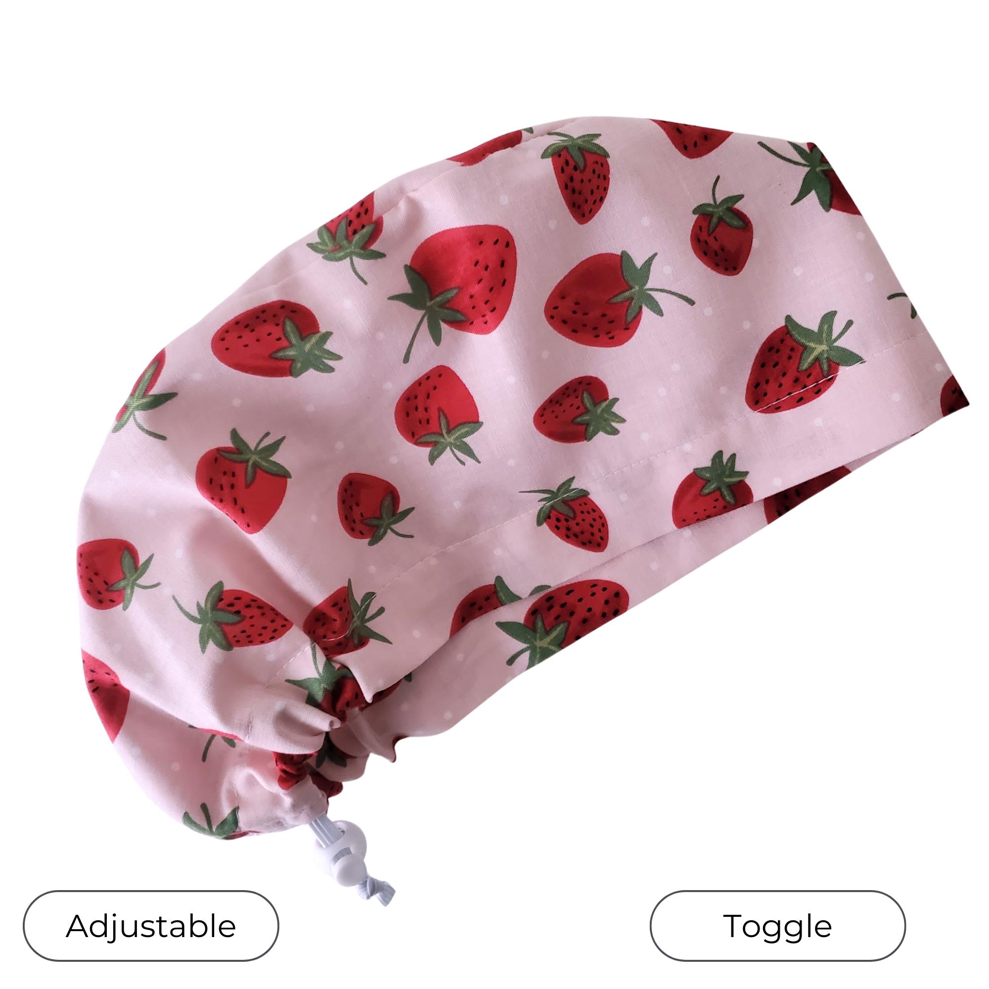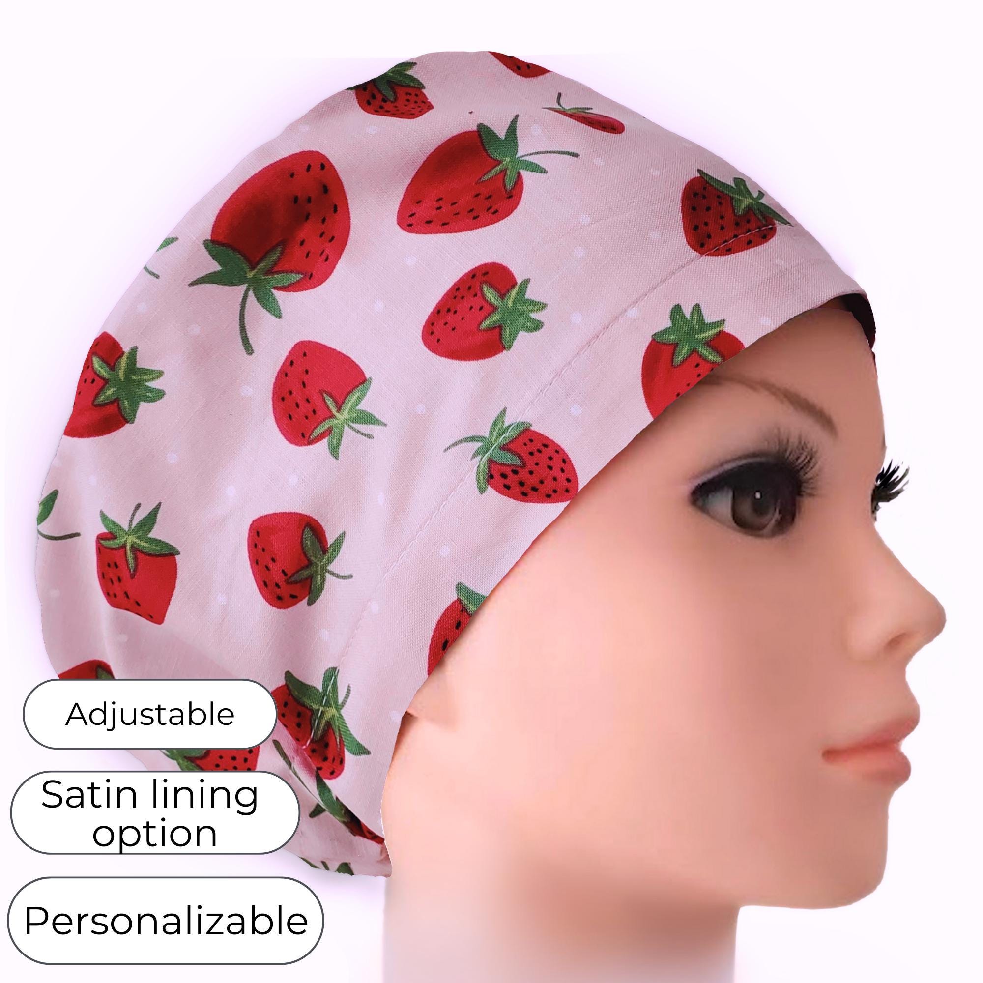 Brighten your workday with this charming strawberry Euro scrub cap, designed to blend cheerful style with professional comfort. Featuring a playful pattern of red strawberries on a soft blush pink background, this scrub hat is perfect for anyone seeking a cute surgical cap that stands out subtly. Whether you’re a nurse, dental professional, or vet tech, the adjustable scrub cap offers a personalized fit and an optional satin lining to keep hair smooth throughout long shifts.