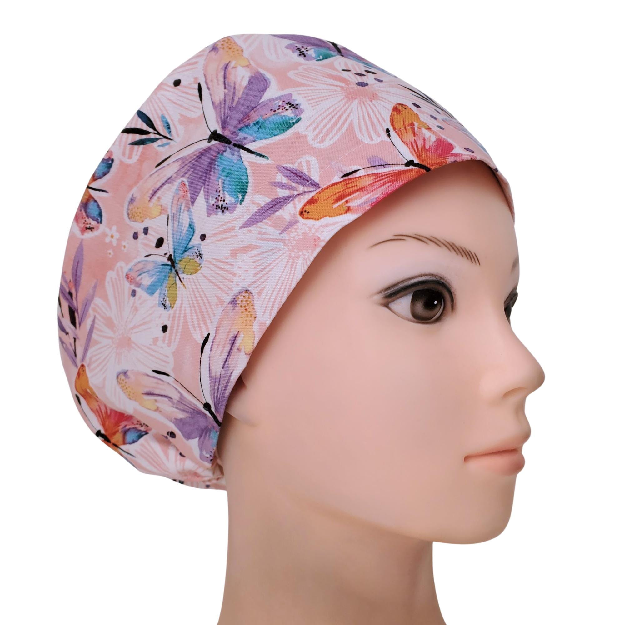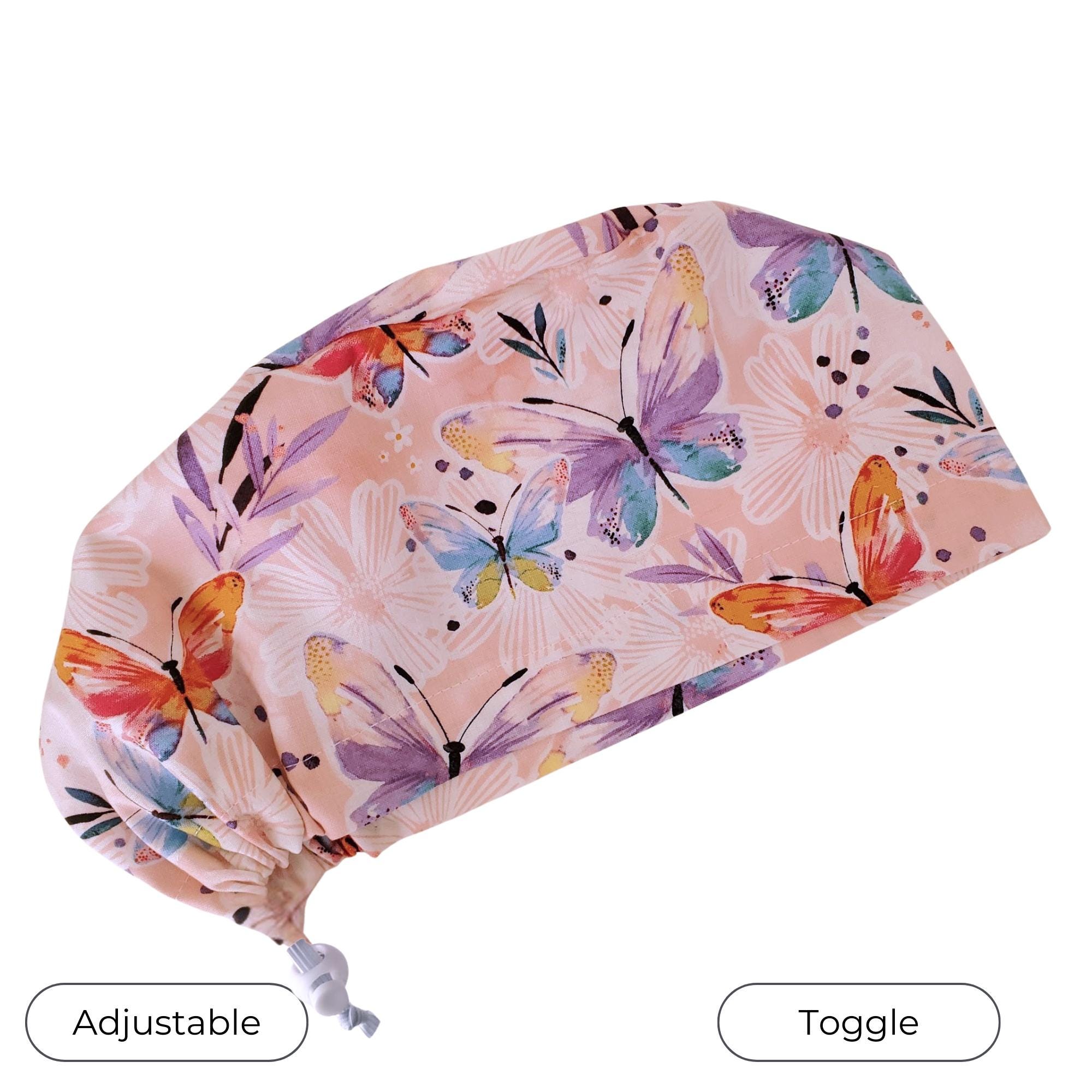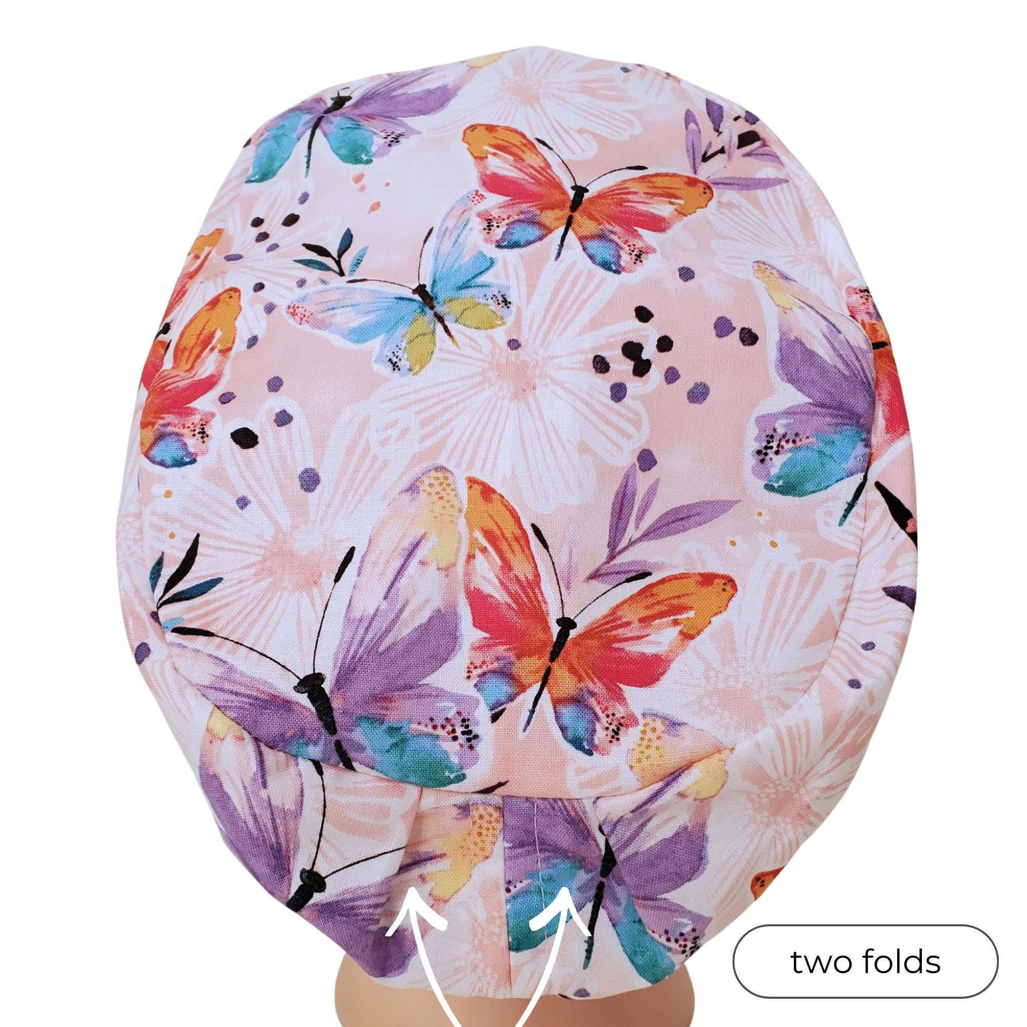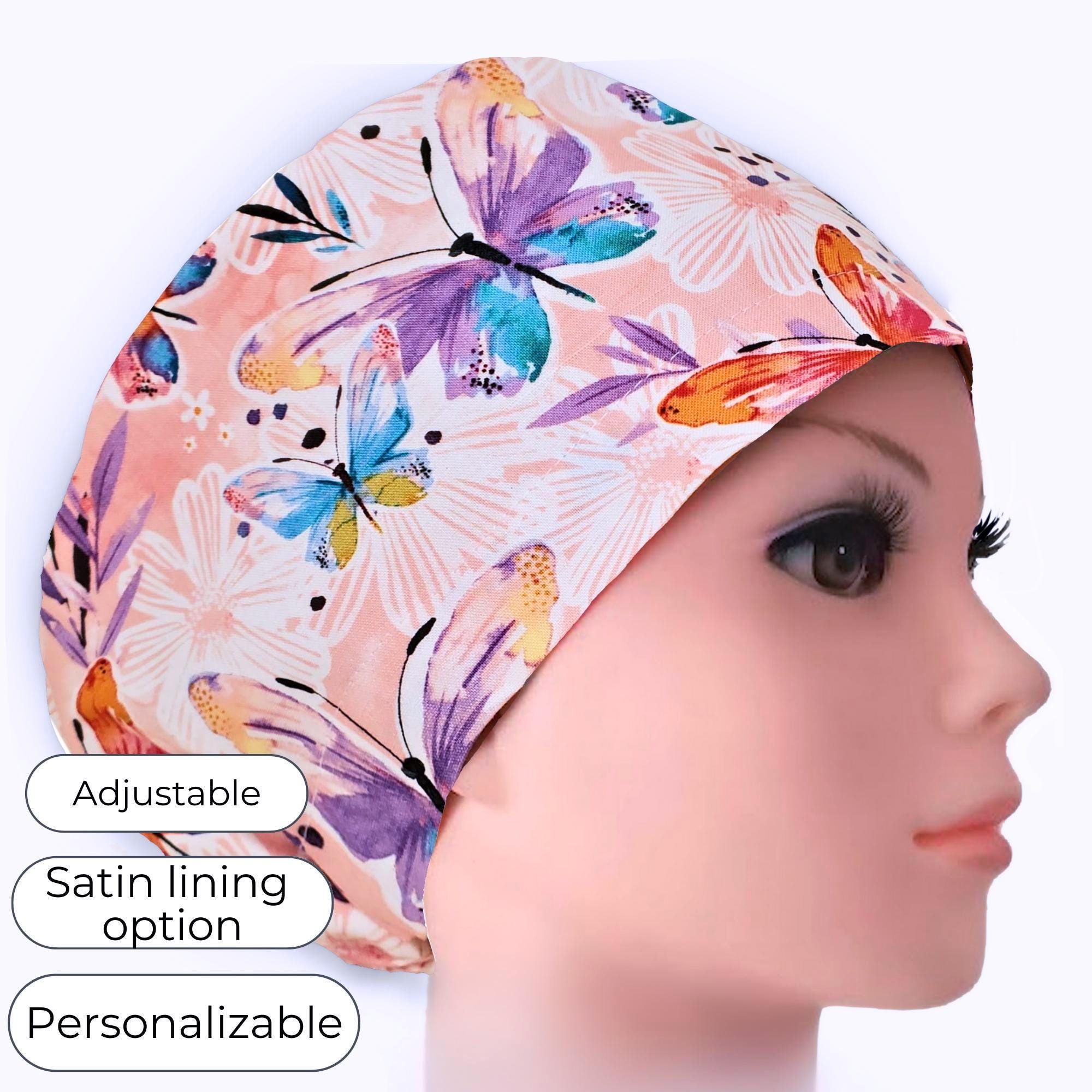 Brighten your workday with this charming strawberry Euro scrub cap, designed to blend cheerful style with professional comfort. Featuring a playful pattern of red butterflies on a soft blush pink background, this scrub hat is perfect for anyone seeking a cute surgical cap that stands out subtly. Whether you’re a nurse, dental professional, or vet tech, the adjustable scrub cap offers a personalized fit and an optional satin lining to keep hair smooth throughout long shifts.