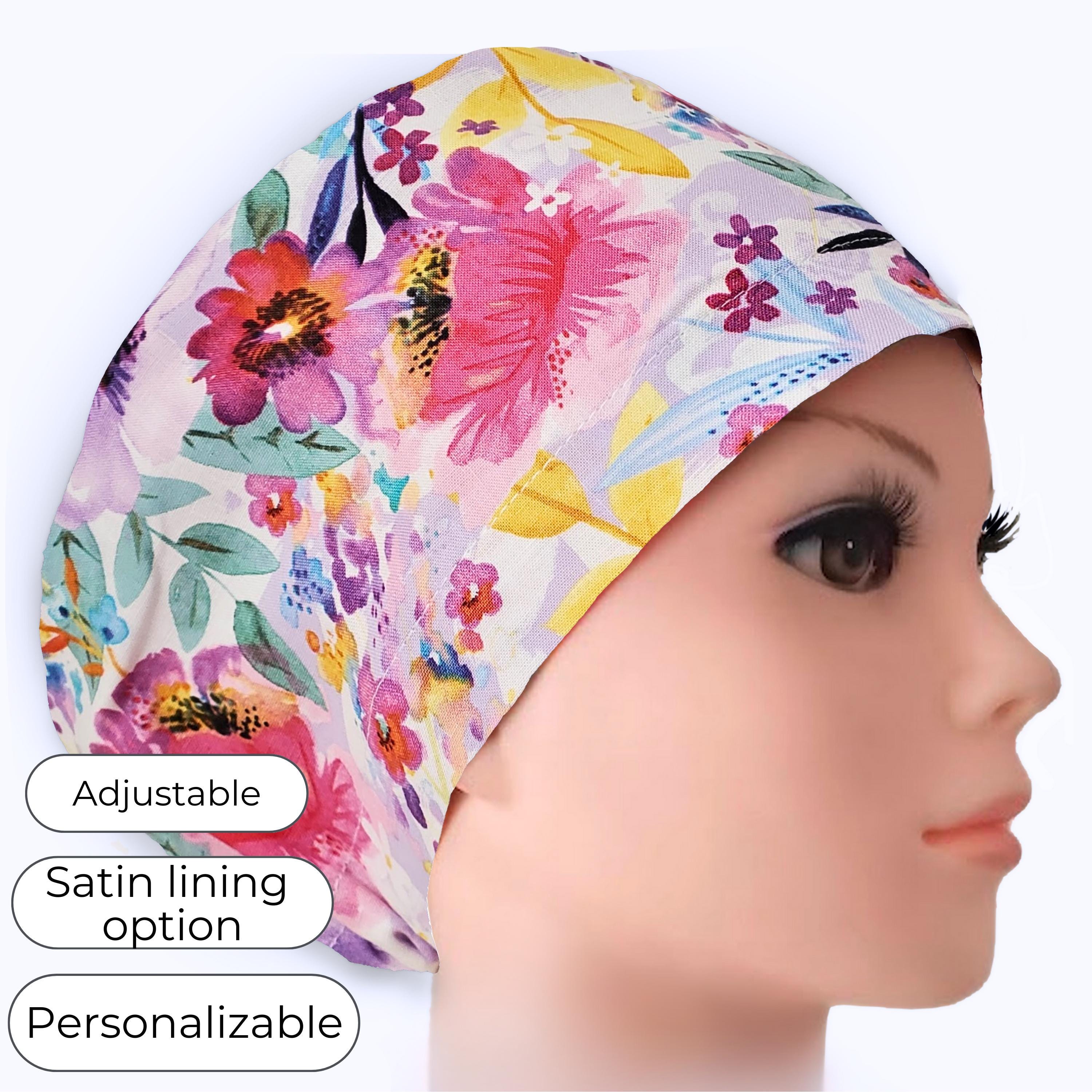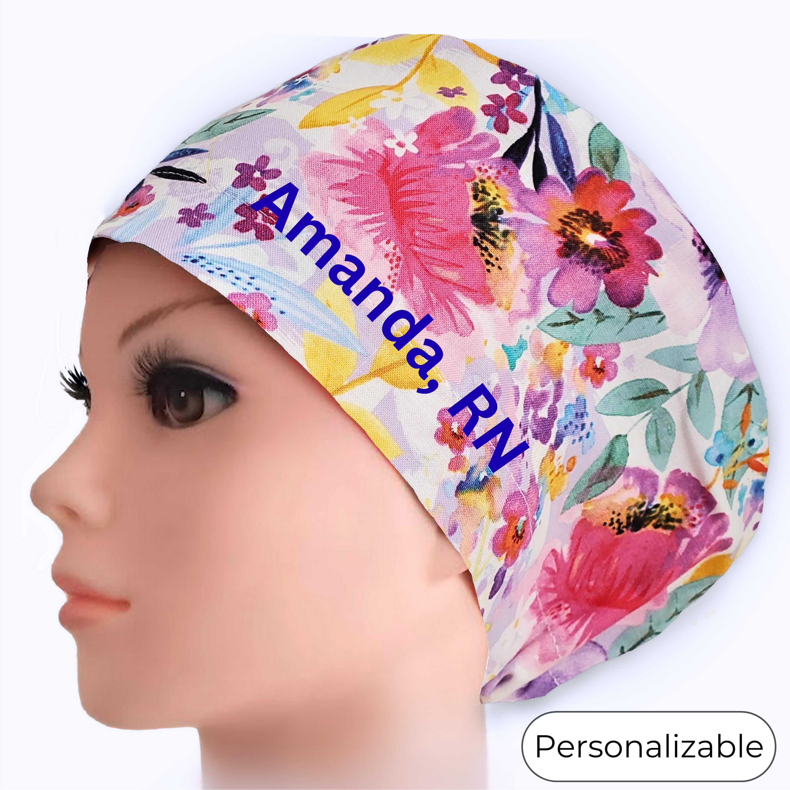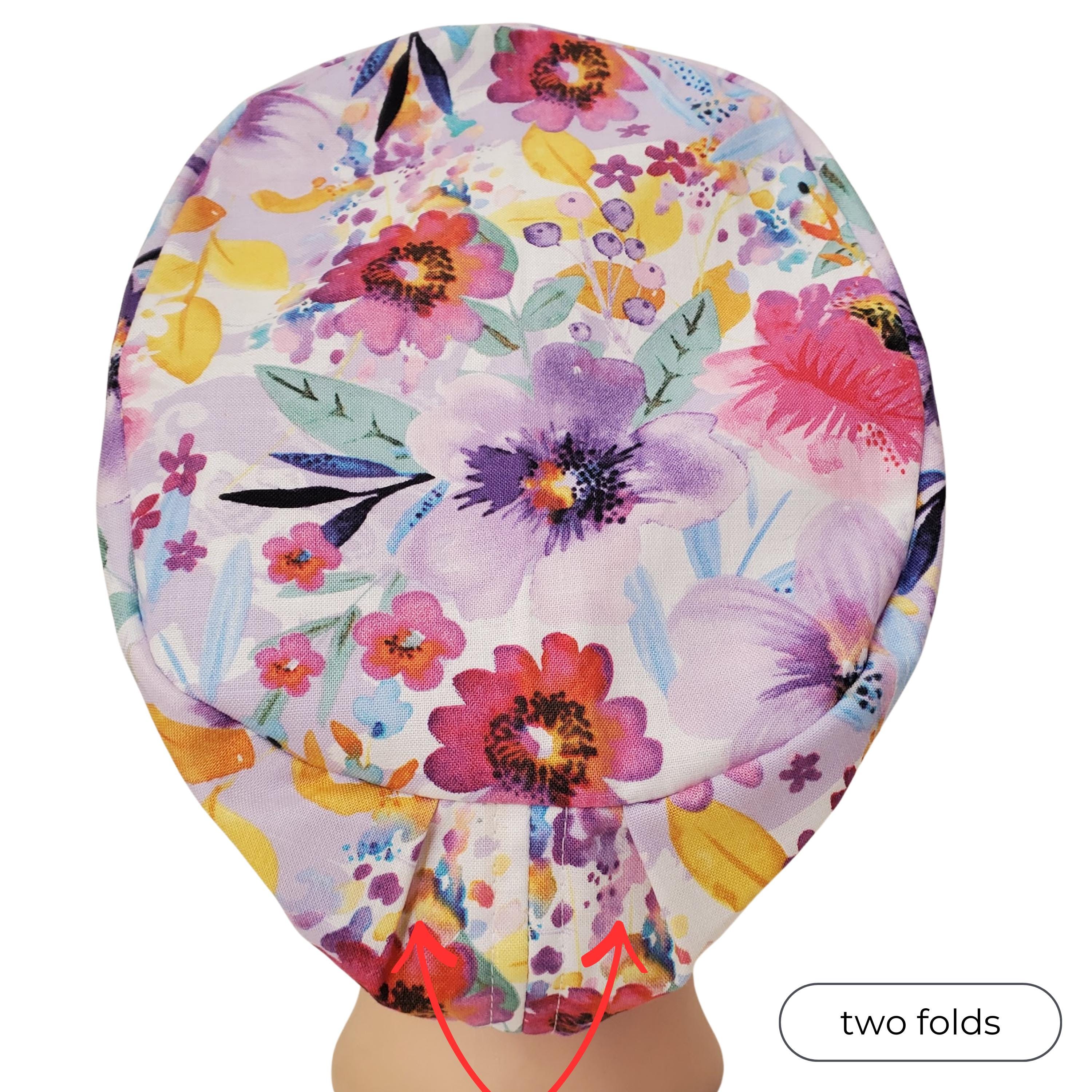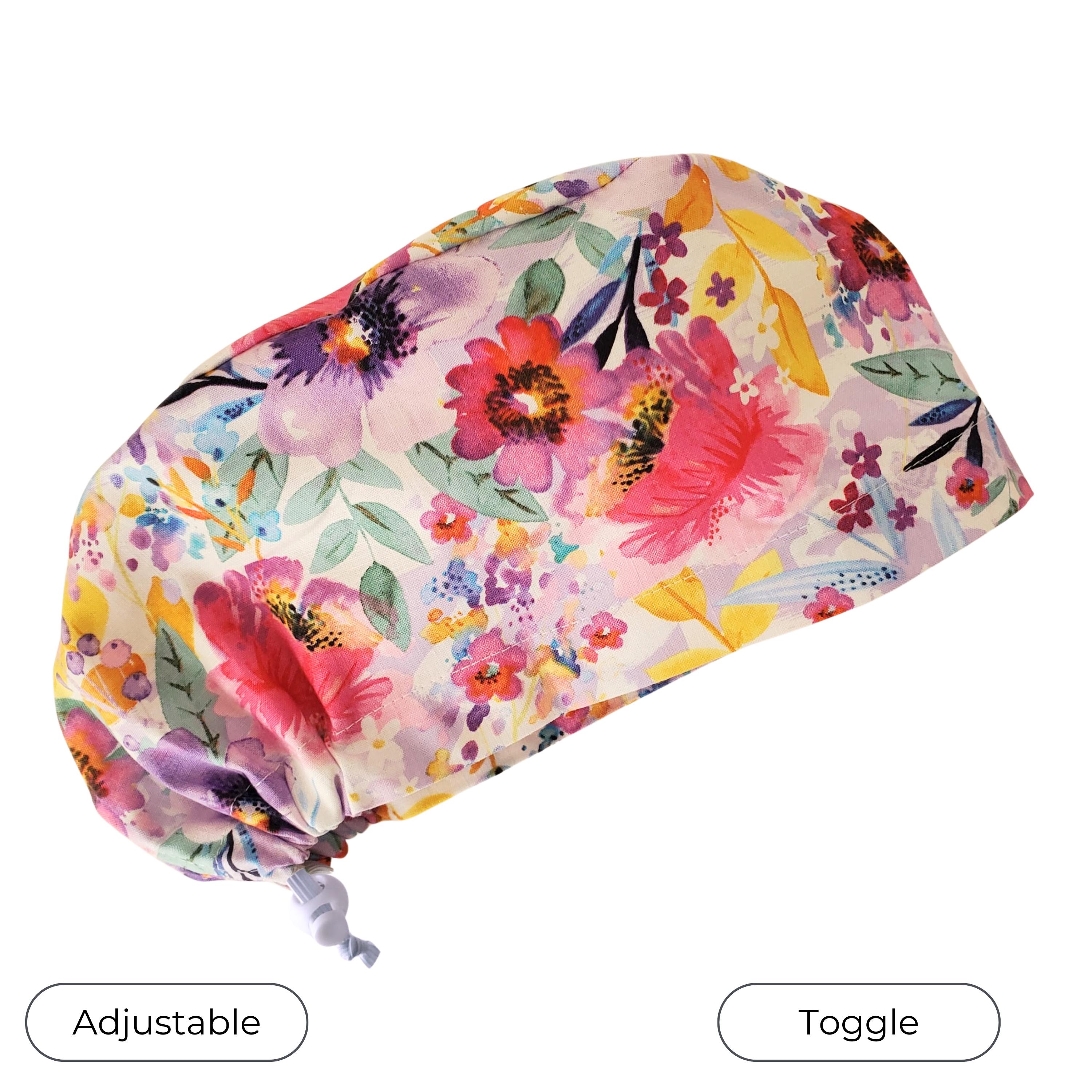 Bright, artistic, and full of color — this floral Euro scrub cap features a vibrant watercolor-style garden print with pink, coral, yellow, and purple flowers on a soft light background. The lively botanical pattern adds personality and brightness to your uniform while keeping a polished, professional look.
