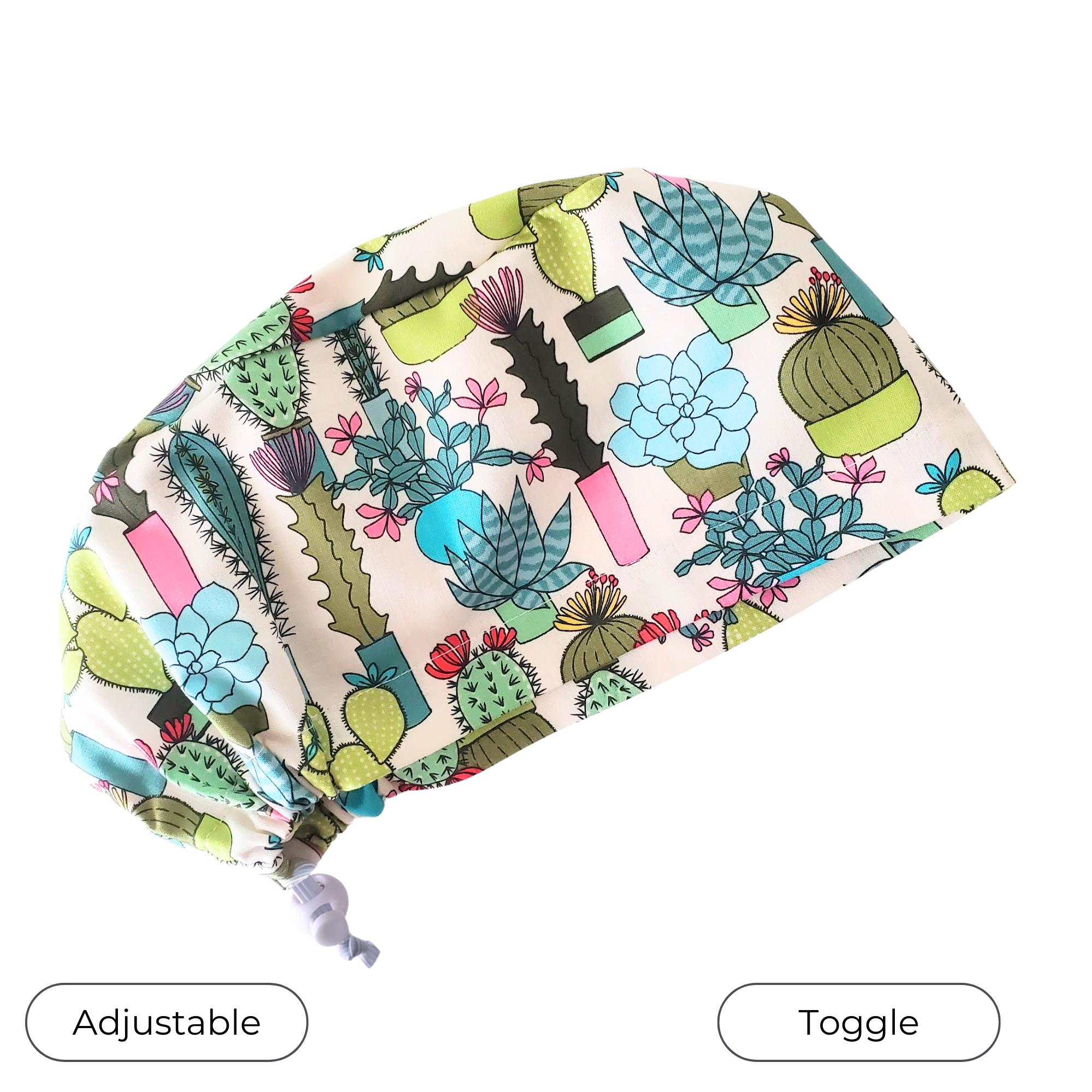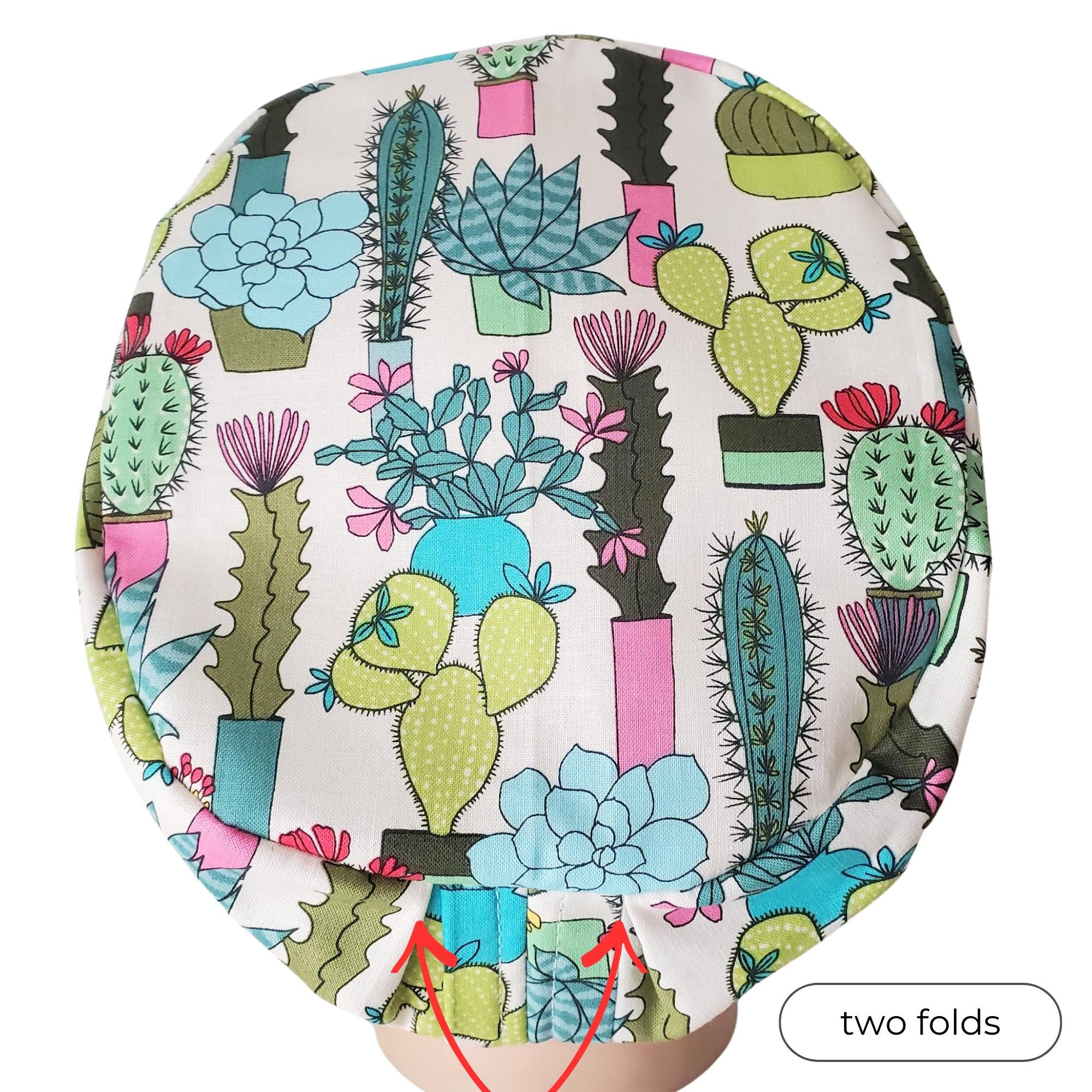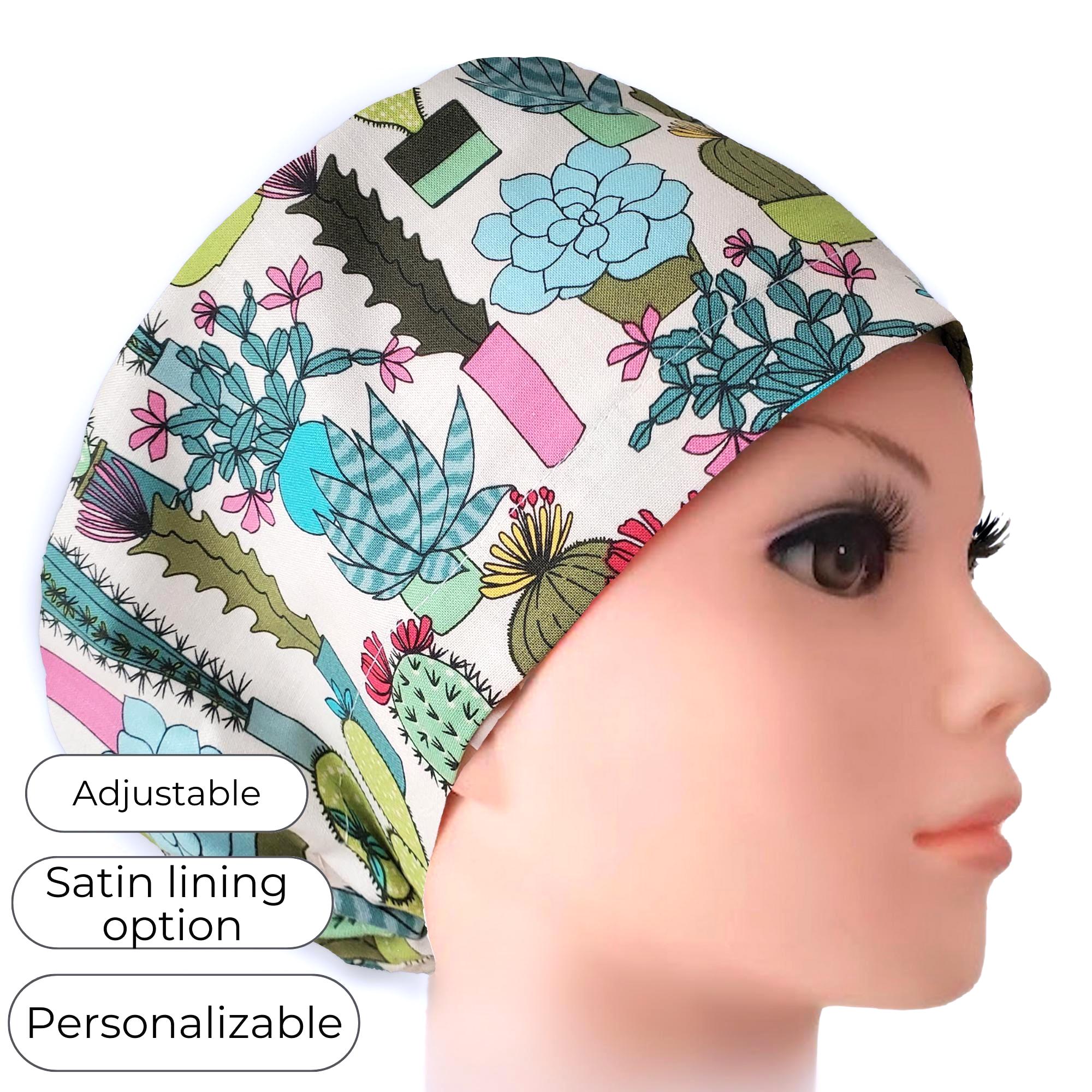 Embrace the refreshing charm of the desert with this Euro surgical cap, featuring a delightful cactus and succulent print that brings a touch of nature to your daily routine. Designed with a classic Euro style and an optional satin lining, this cap effortlessly combines comfort and professionalism while adding a cute surgical cap flair to your workwear. Whether you're a nurse, vet tech, or healthcare professional, this botanical scrub cap is crafted to brighten your day and keep you comfortable throughout long shifts.