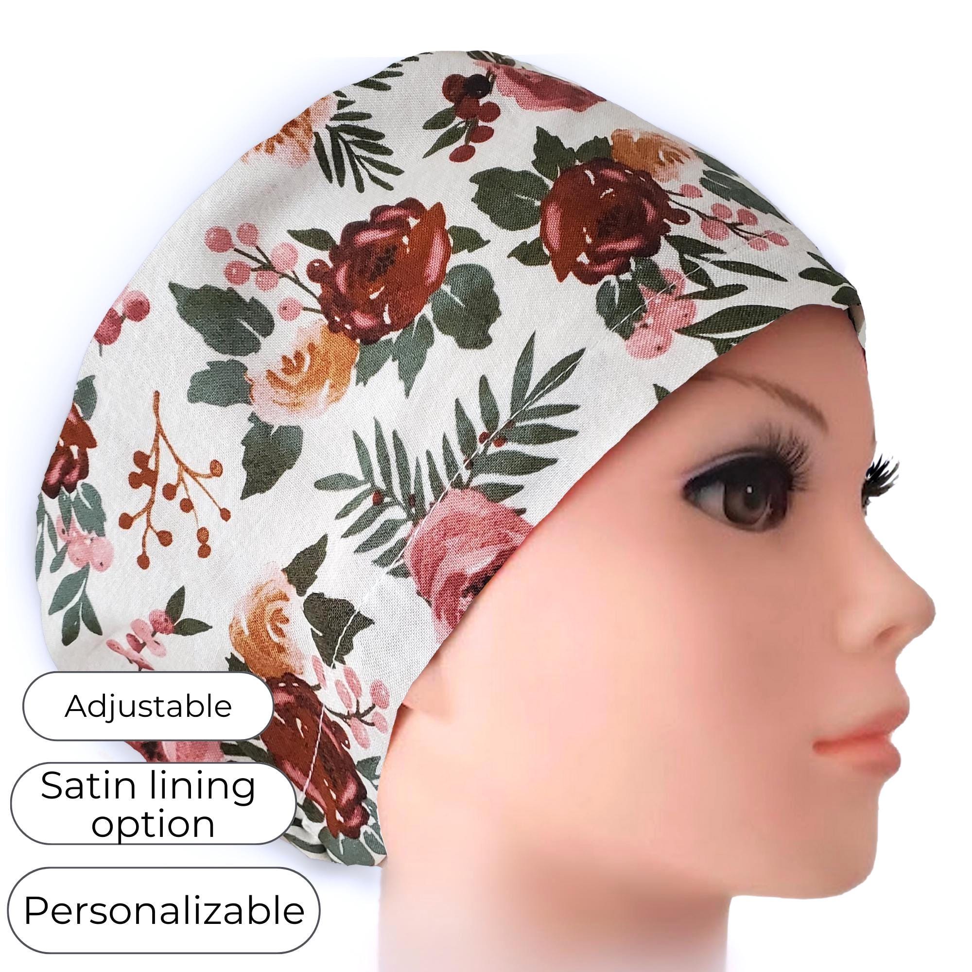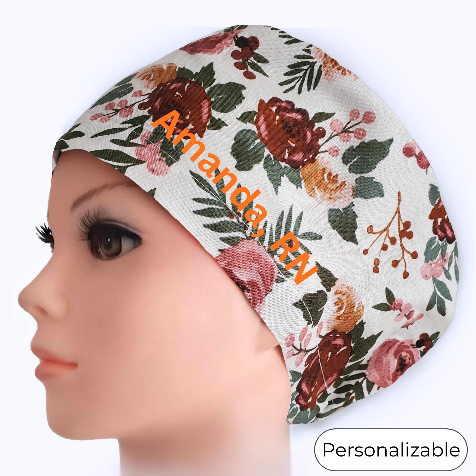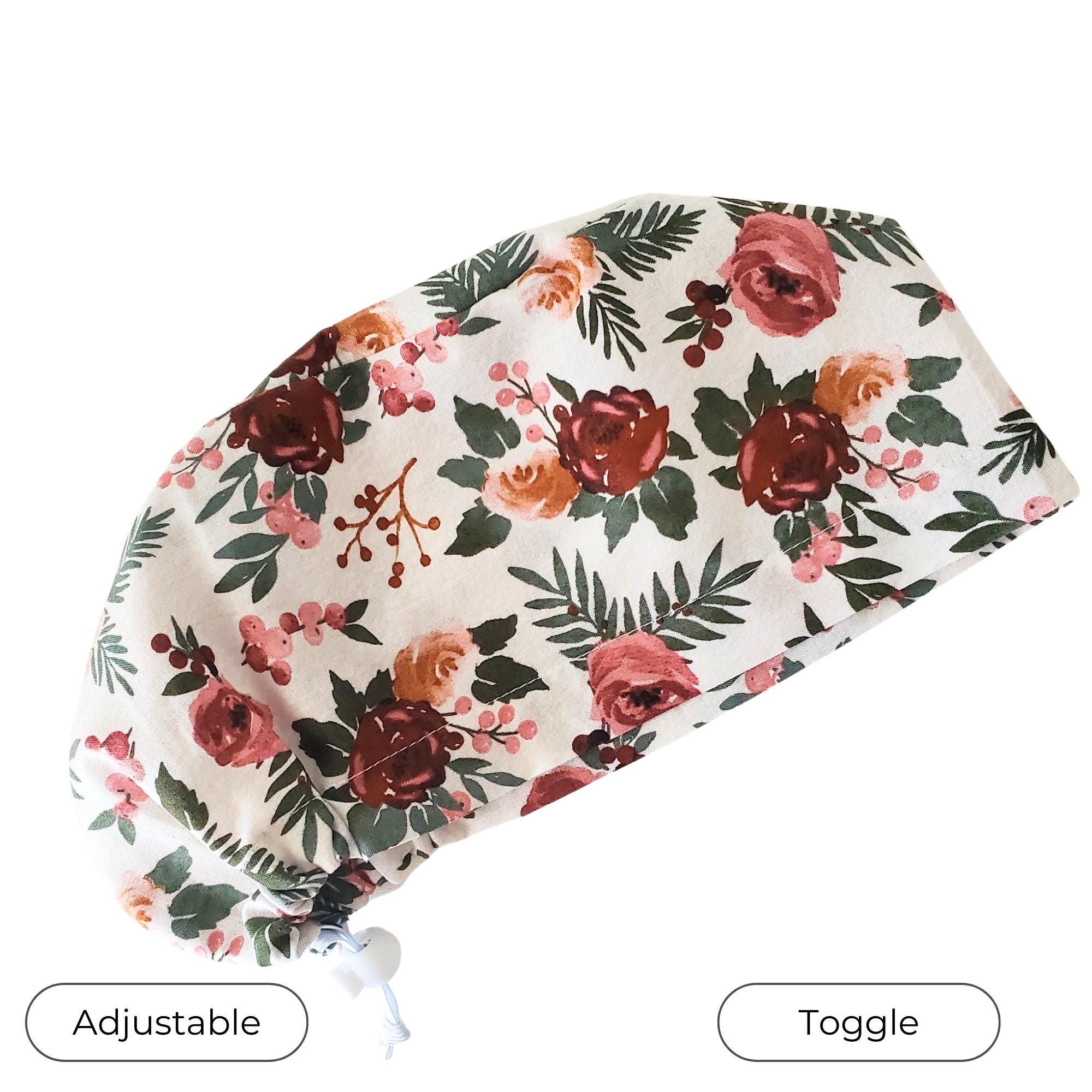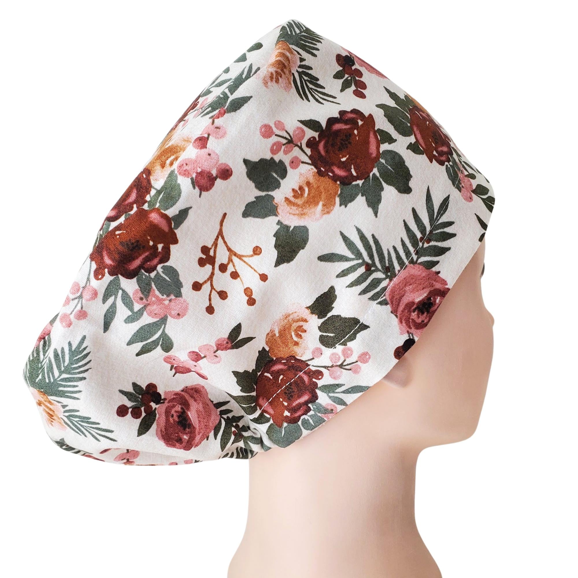 Soft, elegant, and timeless — this floral Euro scrub cap features romantic burgundy and blush roses with muted greenery on a light background. The warm botanical tones create a calm, polished look that pairs beautifully with most scrubs.
