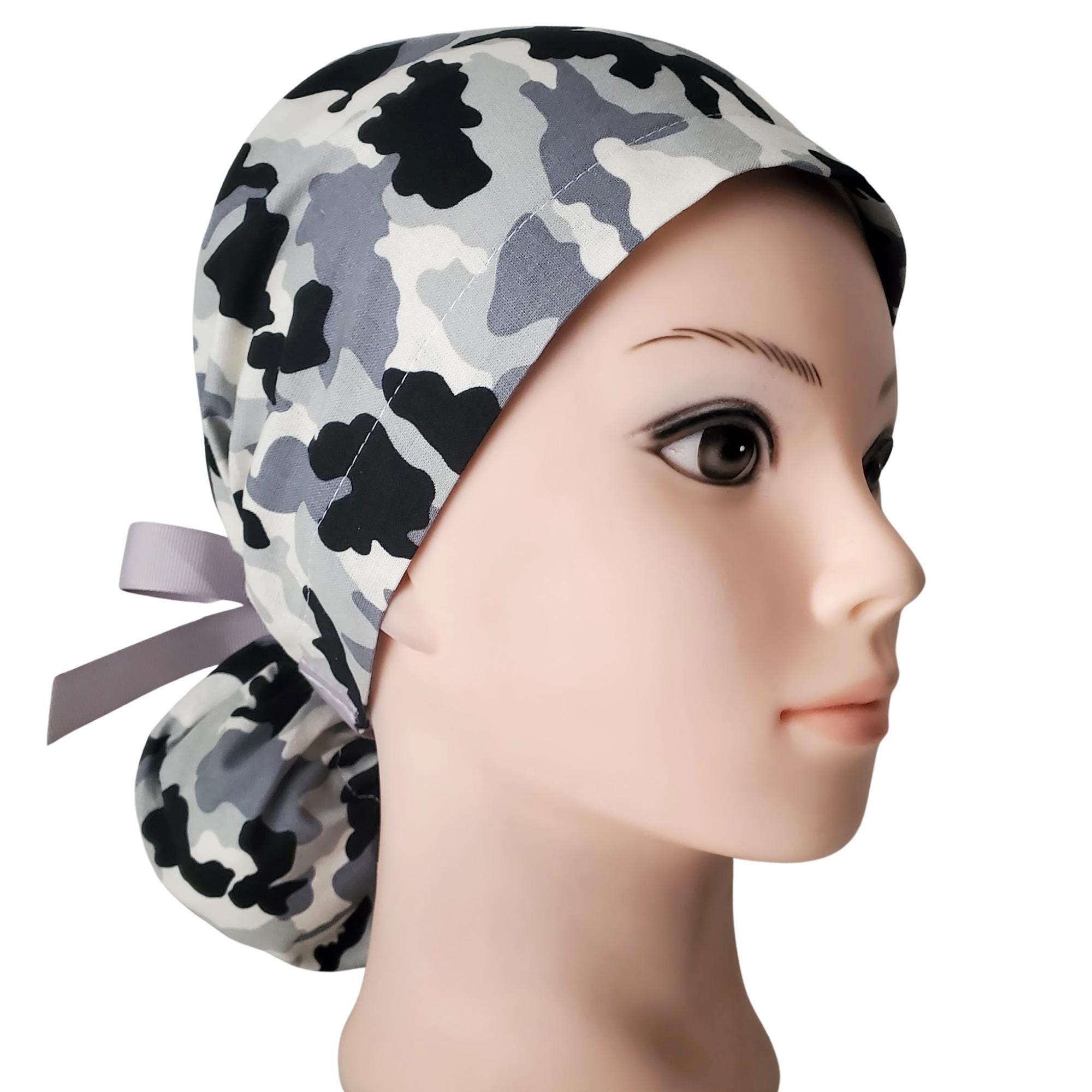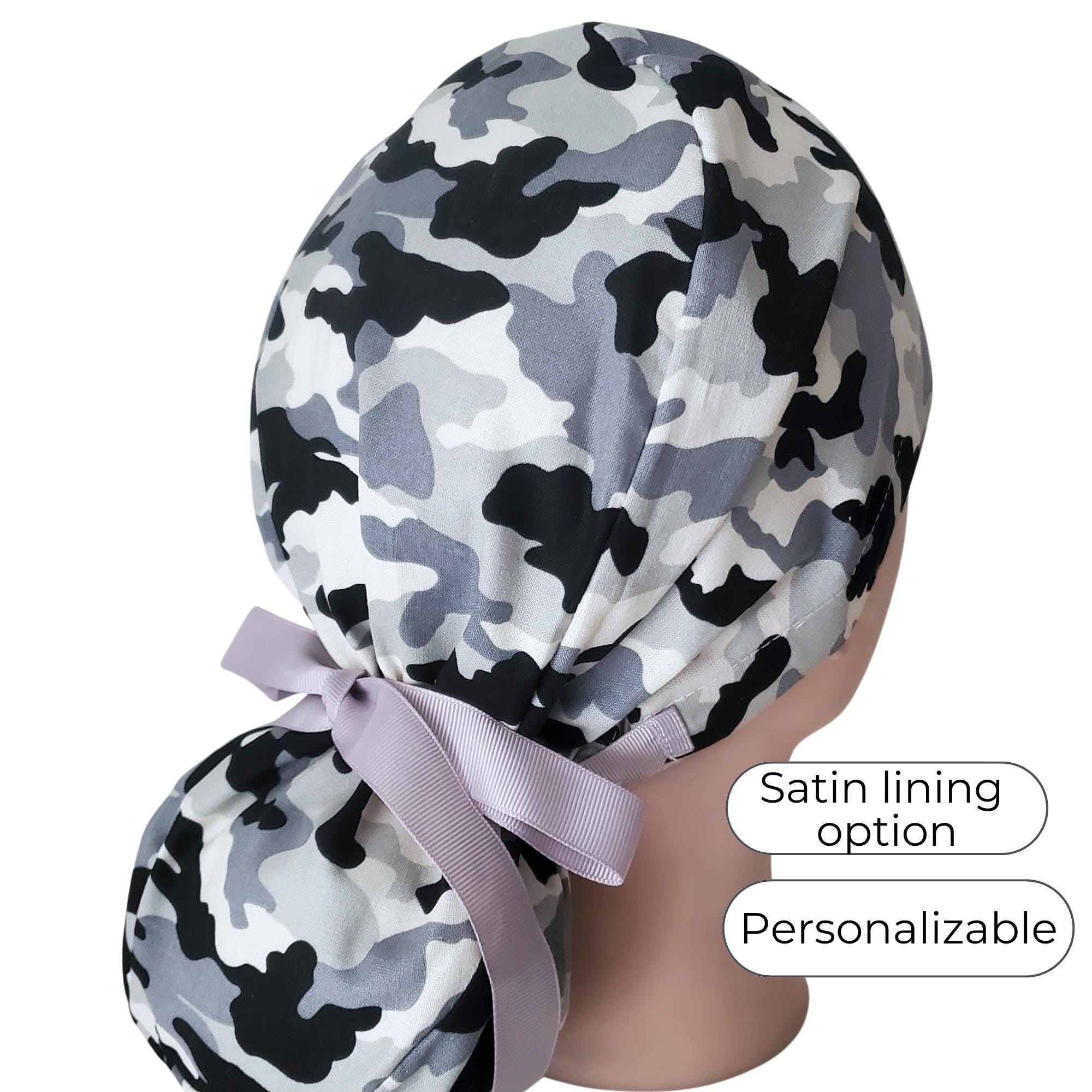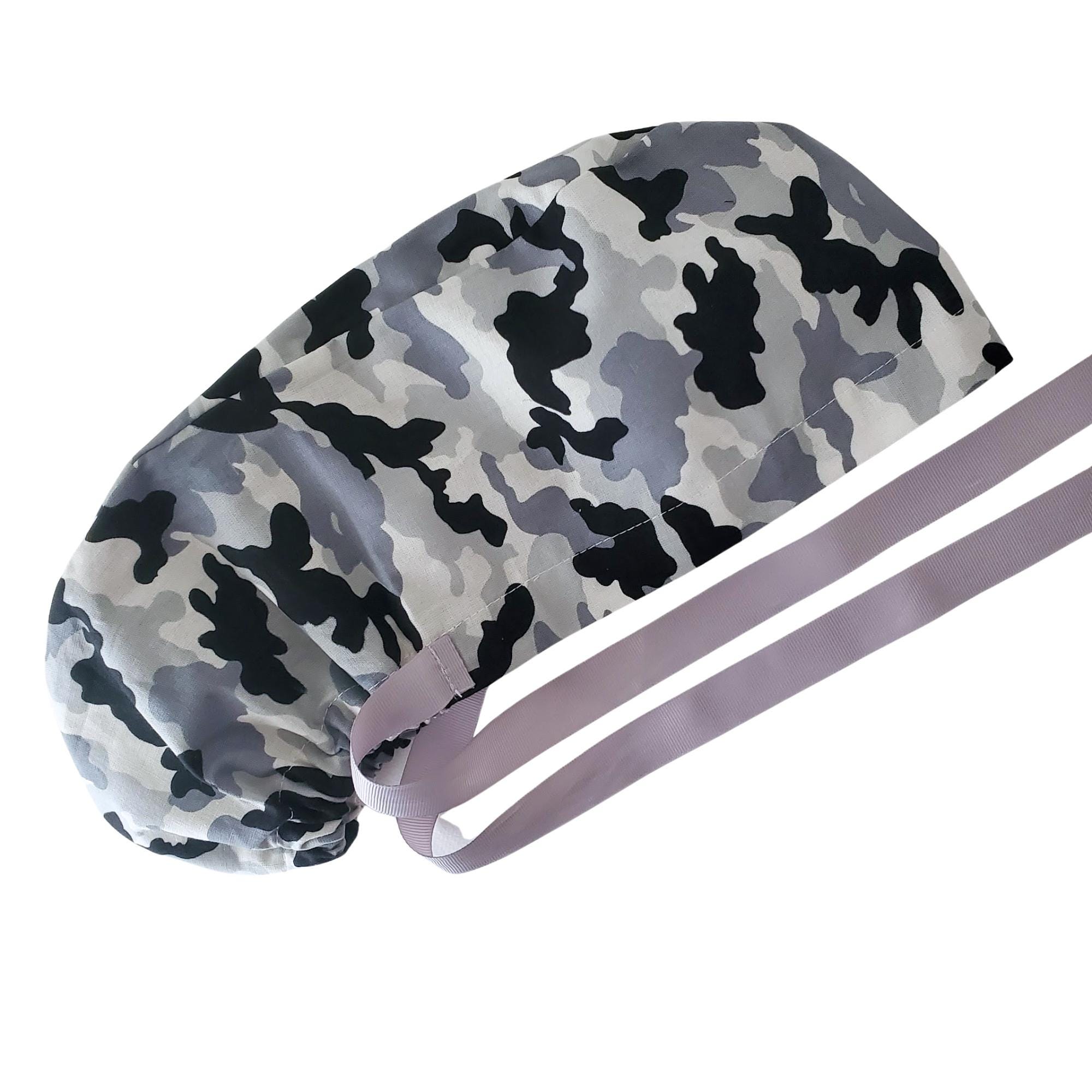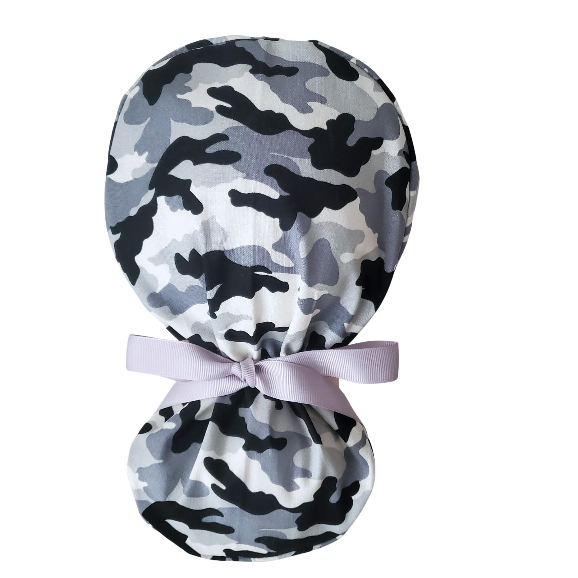 Bright, colorful, and full of life — this floral ponytail scrub cap features a vibrant Camouflage Gray Black and White print. The coordinating Gray ribbon tie adds a polished and feminine finishing touch.