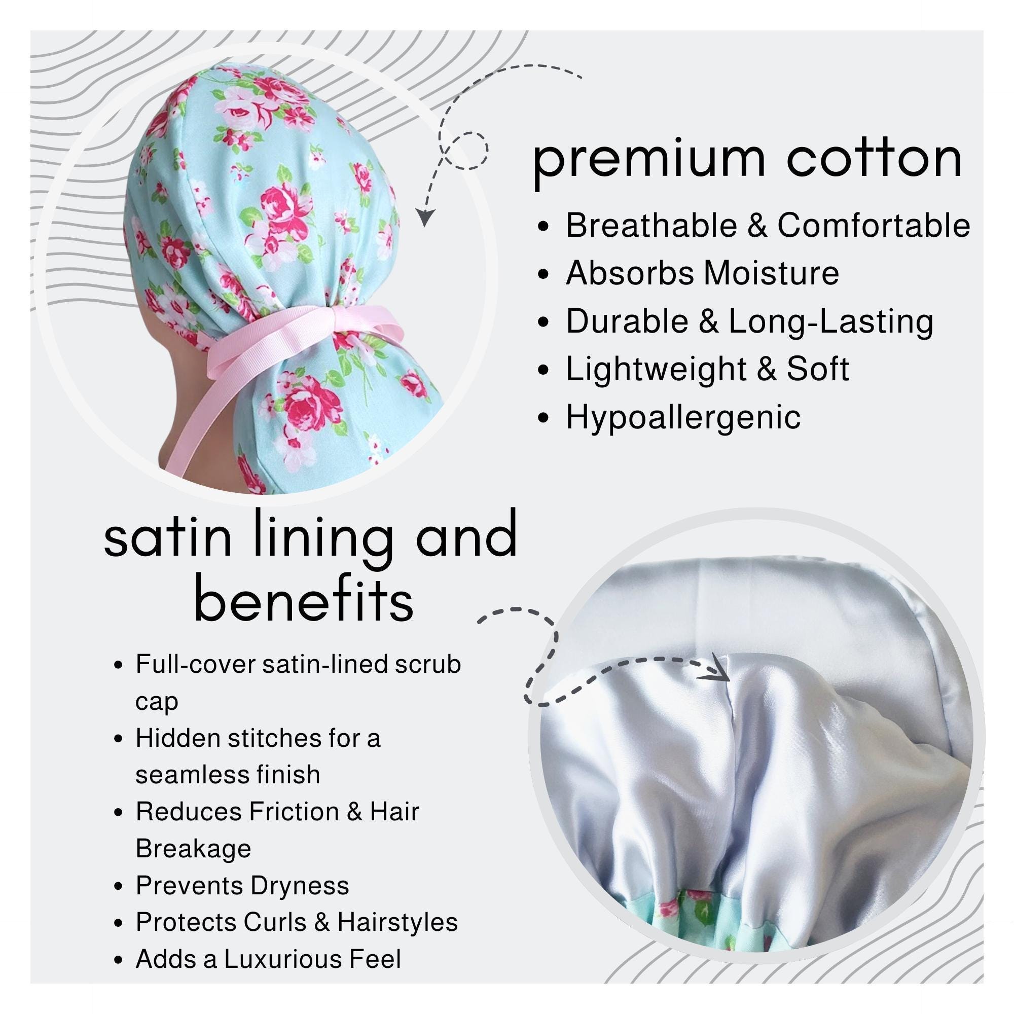 Designed in a ponytail style, this scrub cap provides extra space in the back to comfortably hold long hair, thick hair, braids, or buns without pulling or flattening.