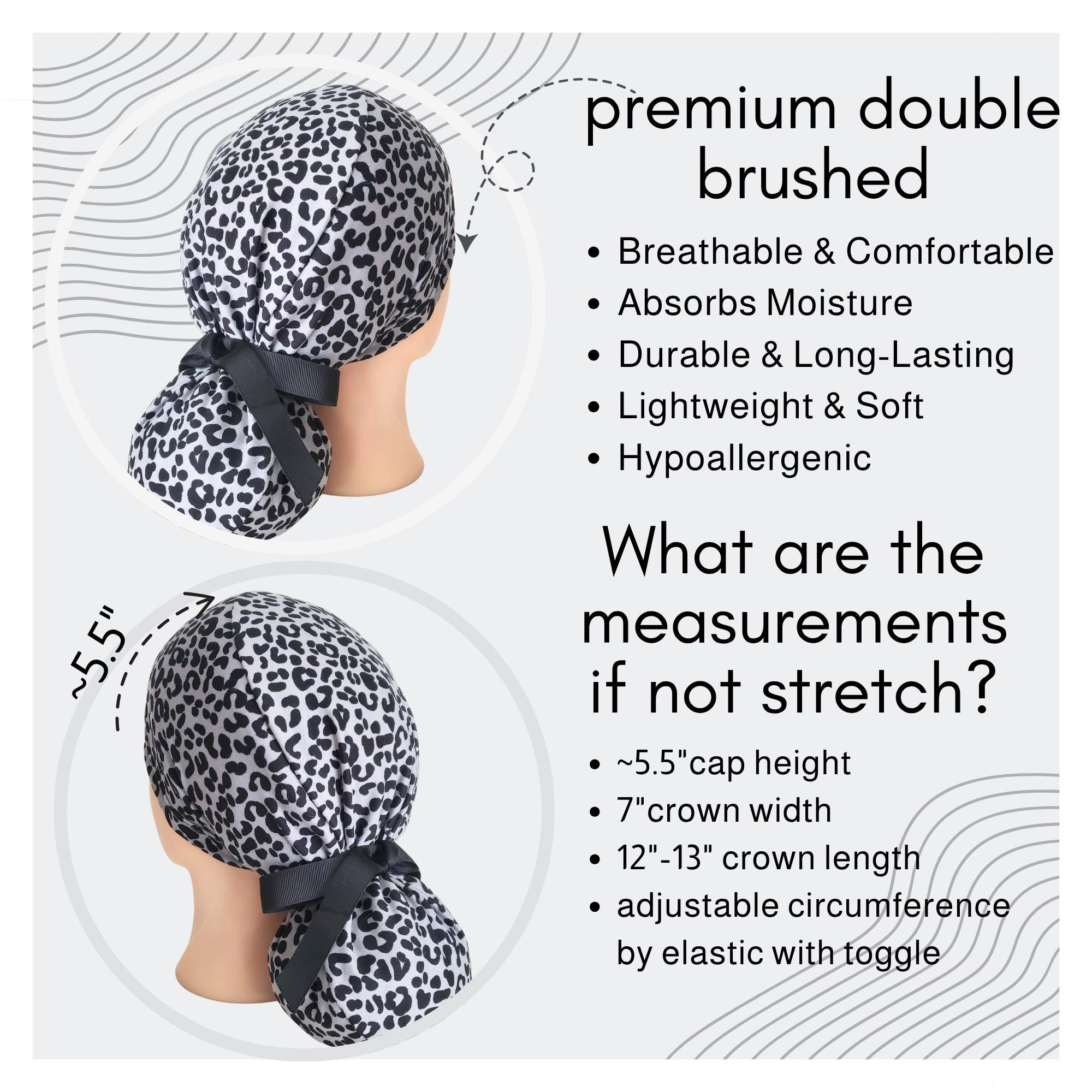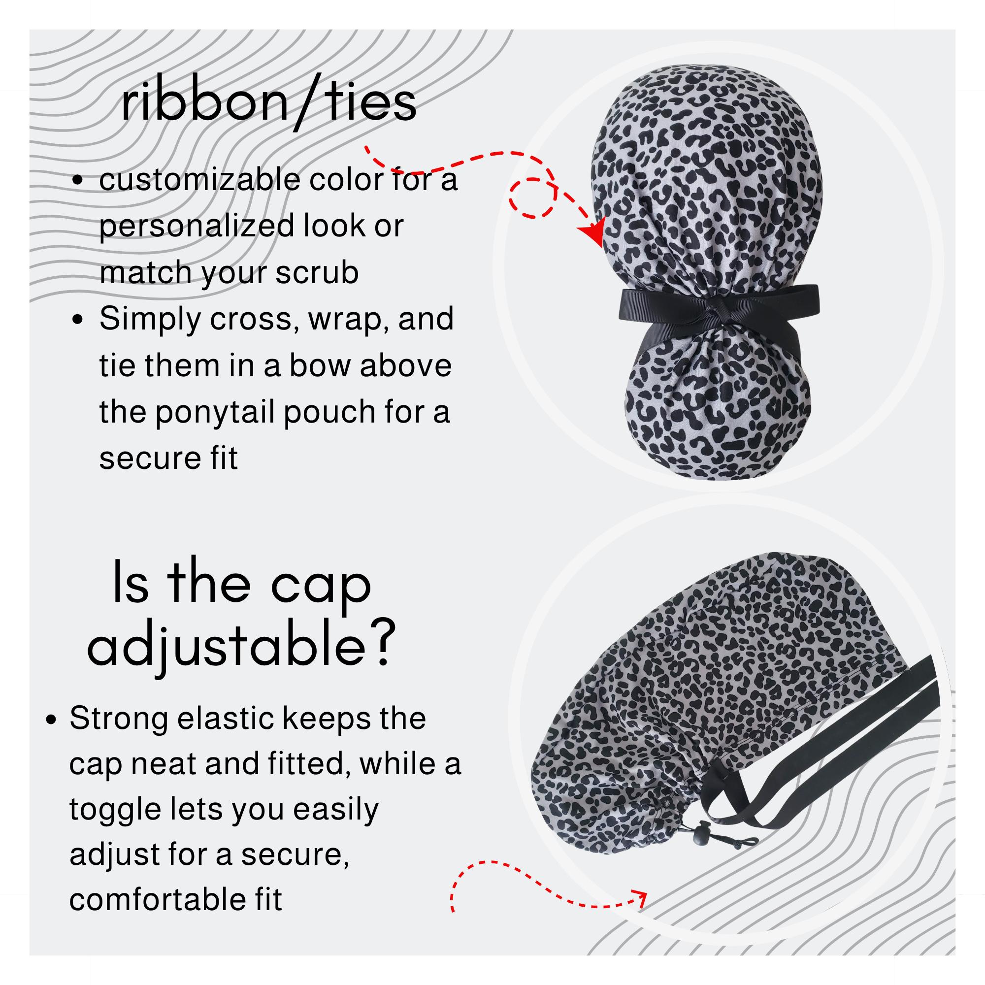 Brighten your workday with this Animal Print scrub cap, thoughtfully designed to blend style and function for healthcare professionals. Crafted from soft, stretchy fabric, this ponytail scrub hat offers a comfortable fit that moves with you throughout busy shifts. Whether you're a nurse, doctor, or vet, this adjustable scrub cap keeps your hair secure while adding a fun medical cap flair.