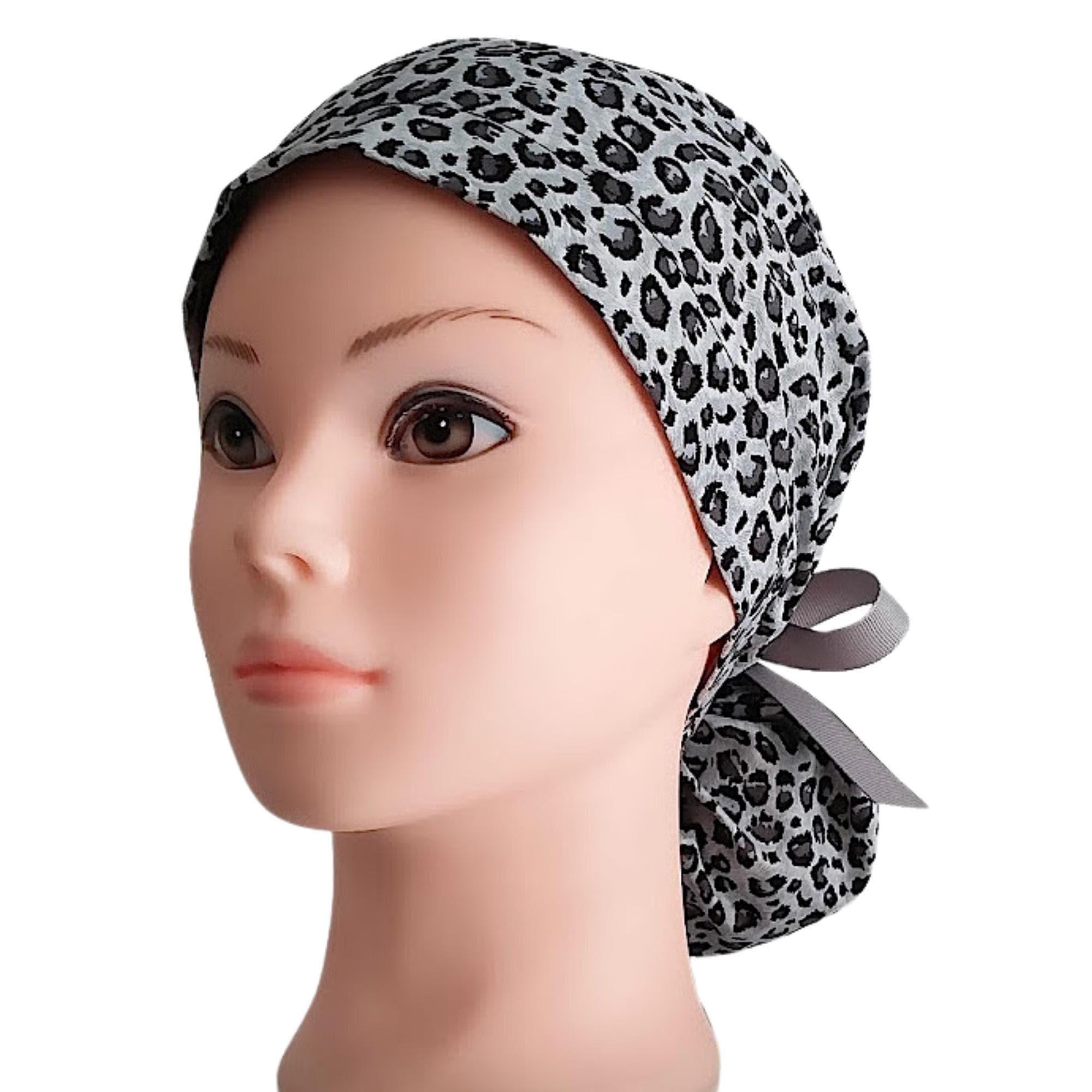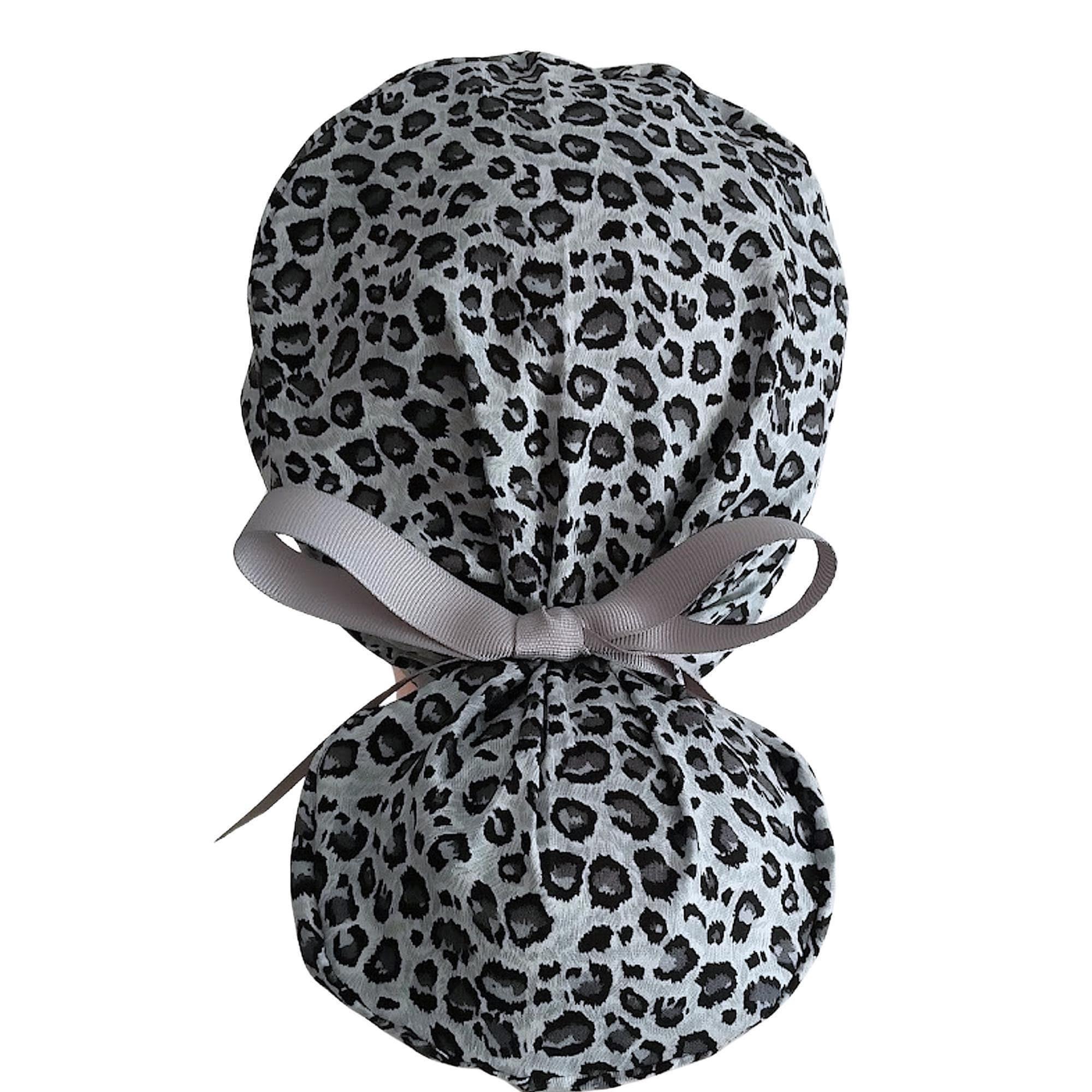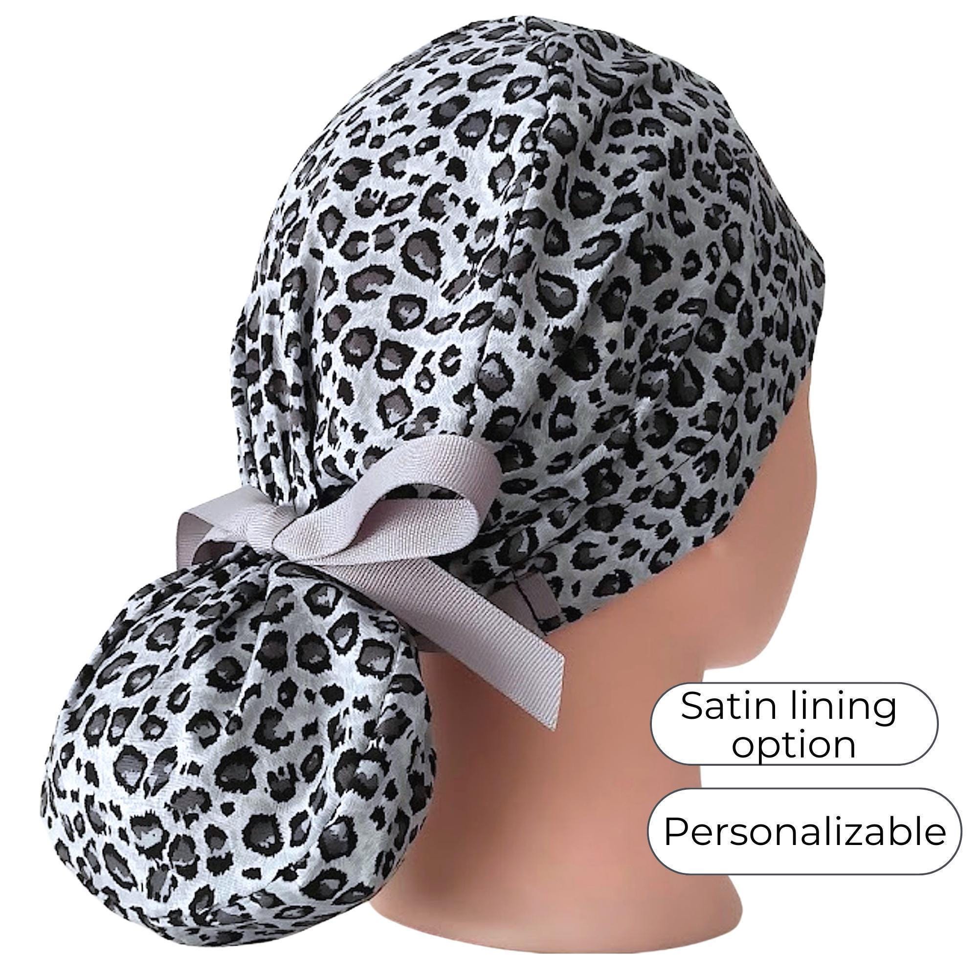 This ponytail scrub cap with satin lining option is handmade from soft, breathable cotton in a bold gray leopard print design. The back features a secure elastic band with a gray ribbon tie, making it easy to adjust for a neat and comfortable fit during long shifts. Designed as a stylish yet practical scrub hat for women, it keeps long hair neatly in place while adding a touch of personality to your uniform.